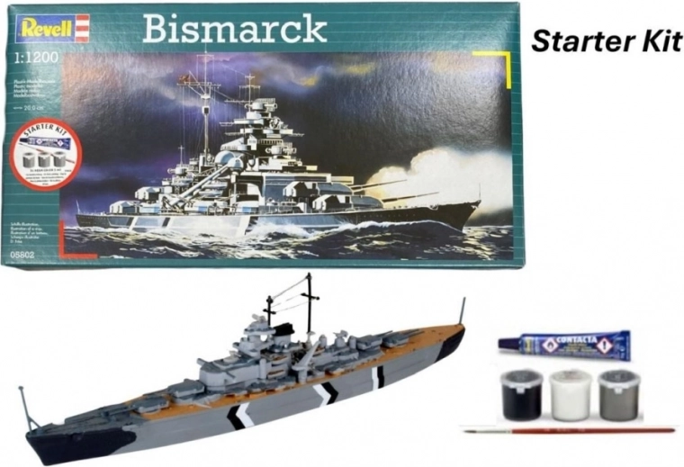 Sada Revell Starter Kit Bismarck v měřítku 1:1200 je skvělou volbou pro začátečníky i pokročilé modeláře. Obsahuje vše potřebné pro stavbu – plastový model, základní barvy, lepidlo, štětec i návod, takže můžete začít ihned po rozbalení. Model věrně zachycuje legendární bitevní loď Bismarck s realistickými detaily trupu, paluby a nástaveb, a nabízí autentický plán zbarvení pro historicky přesný vzhled.