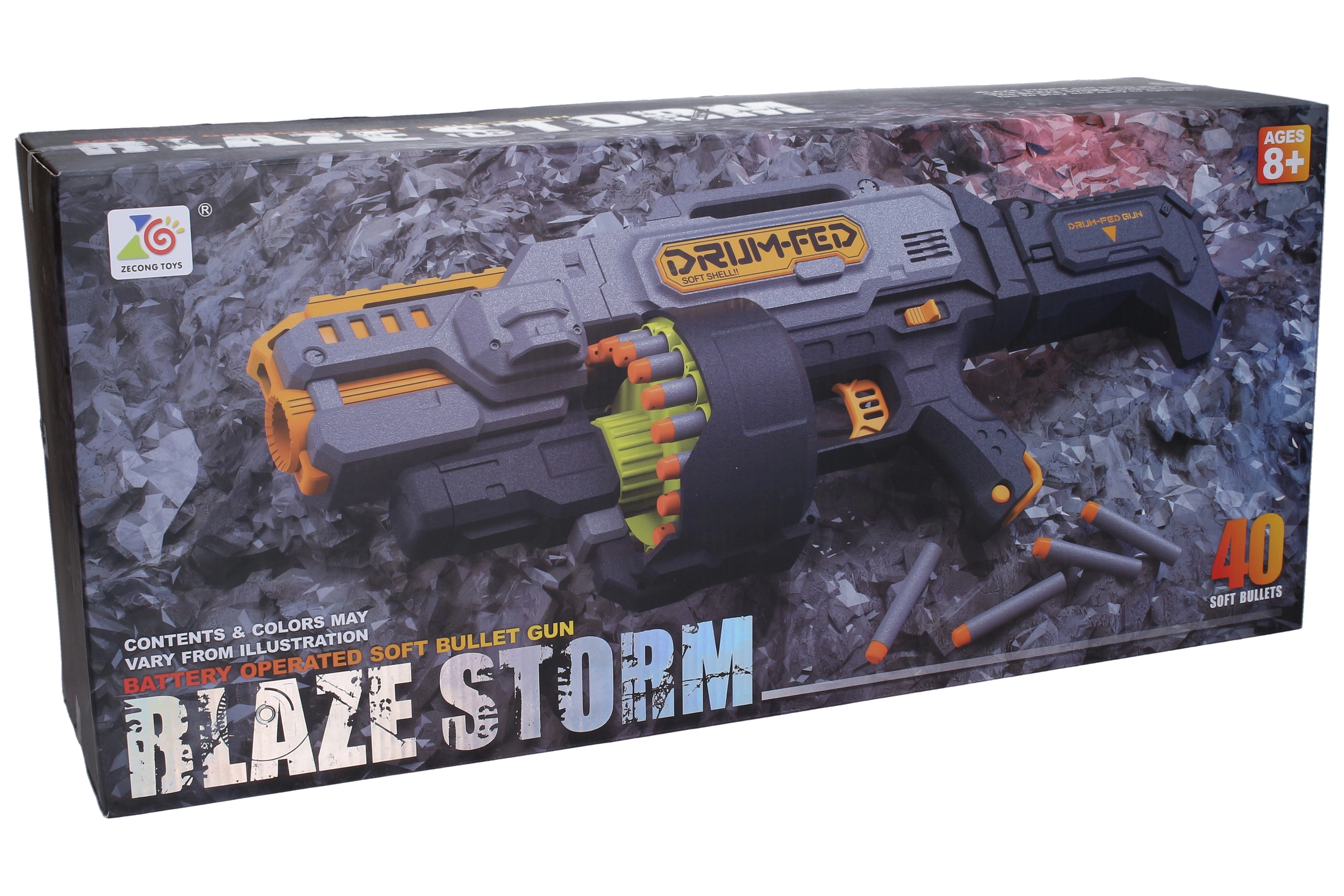 Výkonný dětský kulomet na pěnové náboje s bubnovým zásobníkem nabízí skvělou zábavu doma i venku. Součástí je 40 měkkých nábojů (standardní i s přísavkou), nabíjecí baterie 3,7 V 500 mAh a USB kabel. Díky přepínači ON/OFF se snadno ovládá a rozměry 56 × 22,5 × 13,3 cm zajišťují pohodlné držení.
