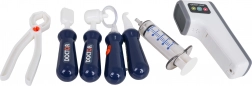 Stetoskop, teploměr, stříkačka, pinzeta, nůžky, dentální nástroje, „rentgenové“ karty, model zubů, karta pacienta a další doplňky.