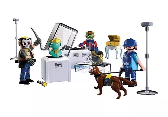 V muzeu je poplach – zloději se snaží vypáčit vitríny a zmizet s kořistí! Policista se tiše plíží výstavní síní a společně se služebním psem zahajují pronásledování. Set PLAYMOBIL Action Heroes přináší dynamický příběh s množstvím realistických doplňků a funkcí, které děti vtáhnou do světa velkých loupeží.