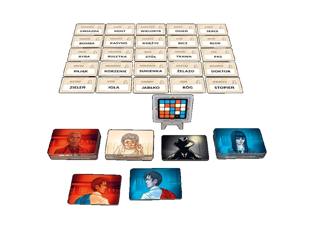 - 16 karet agentů ve 2 barvách; 1 karta dvojitého agenta; 7 karet nevinných kolemjdoucích; 1 karta vraha; 40 karet klíčů; 200 karet s 400 kódovými názvy; pravidla hry; stojánek