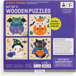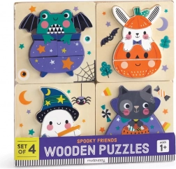 Sada obsahuje čtyři samostatná dřevěná puzzle s něžnými halloweenskými ilustracemi od Wendy Kendall. Každé puzzle má hladkou dřevěnou základní desku s malovanou scénou, do které děti snadno vkládají velké dílky. Ideální jako první puzzle – bezpečné, přehledné a zábavné.