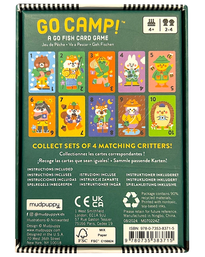 Objevte zábavu na téma kempování s karetní hrou Mudpuppy Jdeme kempovat. Díky jednoduchým pravidlům a krásným ilustracím si ji užijí děti i dospělí. Hra je kompaktní, takže se perfektně hodí do batohu na výlety i na deštivé dny doma.