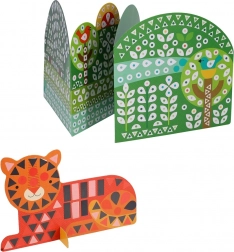 - Více než 1000 předřezaných samolepek, zvířecí postavy (tygr, krokodýl, opice, páv, sova, lev), oboustranné rozkládací pozadí