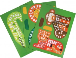 S touto hravou mozaikovou sadou si děti poskládají vlastní zvěřinec. Spojují barvy teček s barvami samolepek a dokončí tak šest zvířat – tygra, krokodýla, opici, páva, sovu a lva. Následně je mohou naaranžovat před oboustranné zelené pozadí a vytvořit si malé divadlo pro vyprávění příběhů.