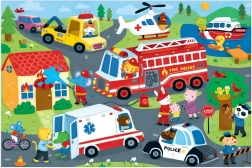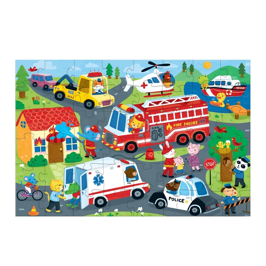 Velké podlahové puzzle MUDPUPPY Záchranná vozidla nadchne všechny malé milovníky sirén a akce. Díky 48 pečlivě vyřezaným dílkům děti snadno poskládají scénu plnou hasičů, policistů a záchranářů. Velké kousky se skvěle drží, nekloužou a pomáhají rozvíjet jemnou motoriku, soustředění i představivost.