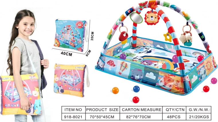 Odnímatelný oblouk je osazen různorodými hračkami: bezpečné zrcátko, hříbek s chrastítkem a kousátkem, včelka s kousátkem a chrastítkem, samostatné kousátko a lvíček s pískátkem. Podložku lze snadno přeměnit na ohrádku nebo suchý bazének a doplnit ji přiloženými míčky. Celý set je uložen v barevné tašce přes rameno pro pohodlné přenášení.