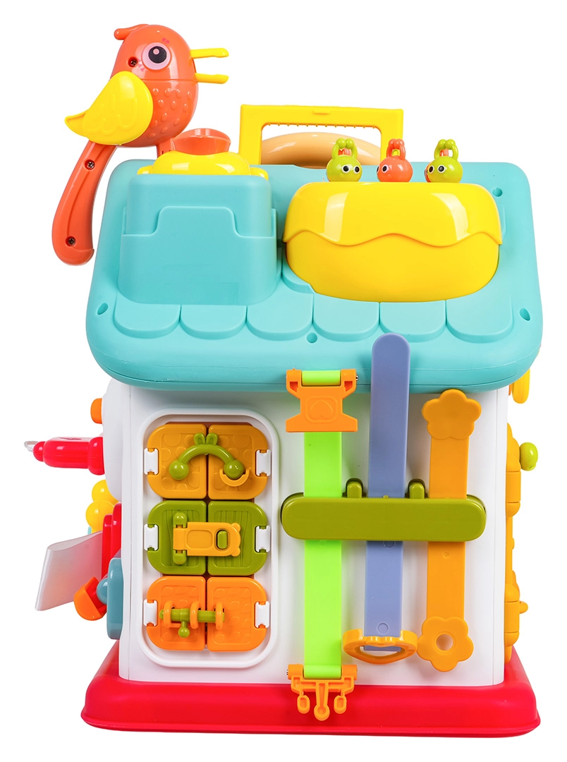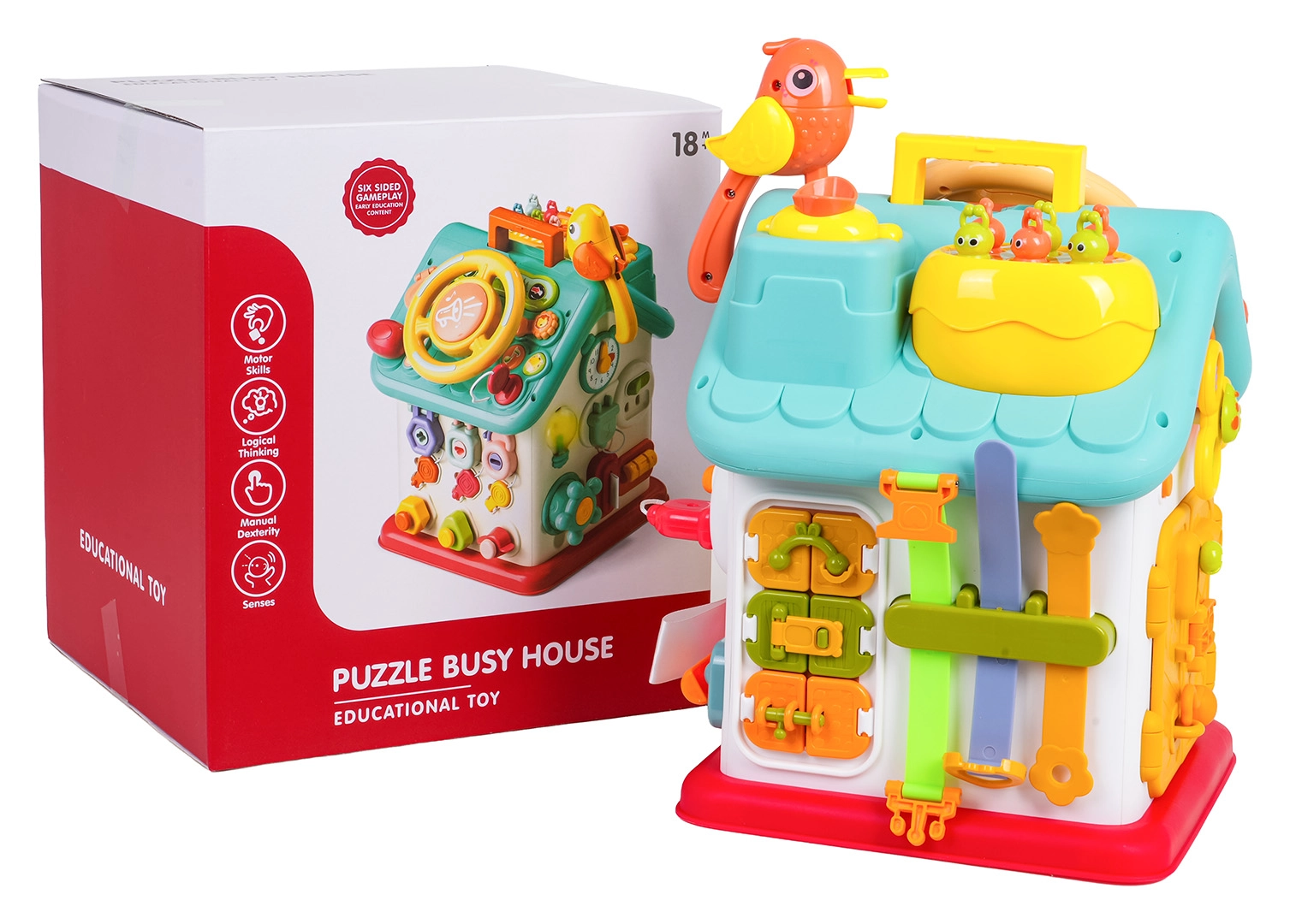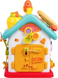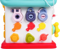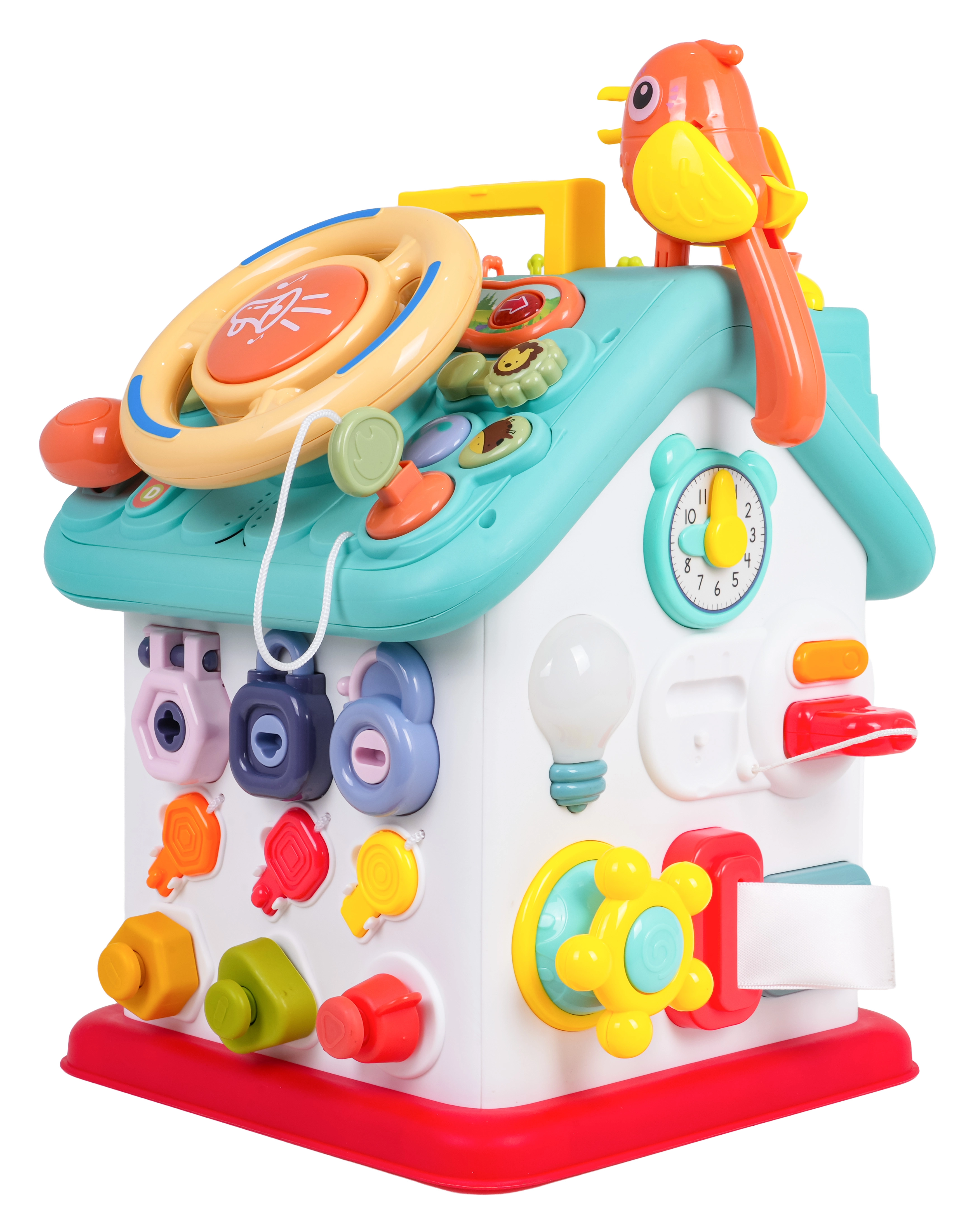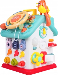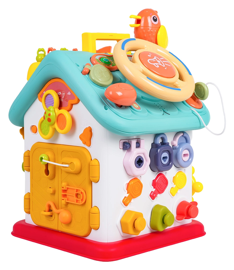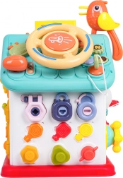 Tento barevný interaktivní domeček nabízí bohaté aktivity na všech stranách i na střeše: podsvícený volant s klaksonem, směrovkami a startérem s klíčkem, sadu zámků a klíčů pro párování, hodiny s pohyblivými ručičkami, vypínače, převody a další manipulativní prvky. Děti si procvičí koordinaci oko–ruka a pochopí princip příčina–následek.