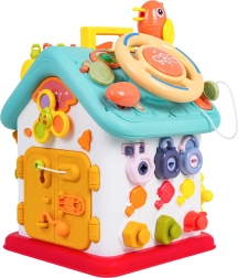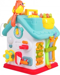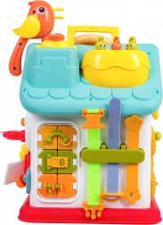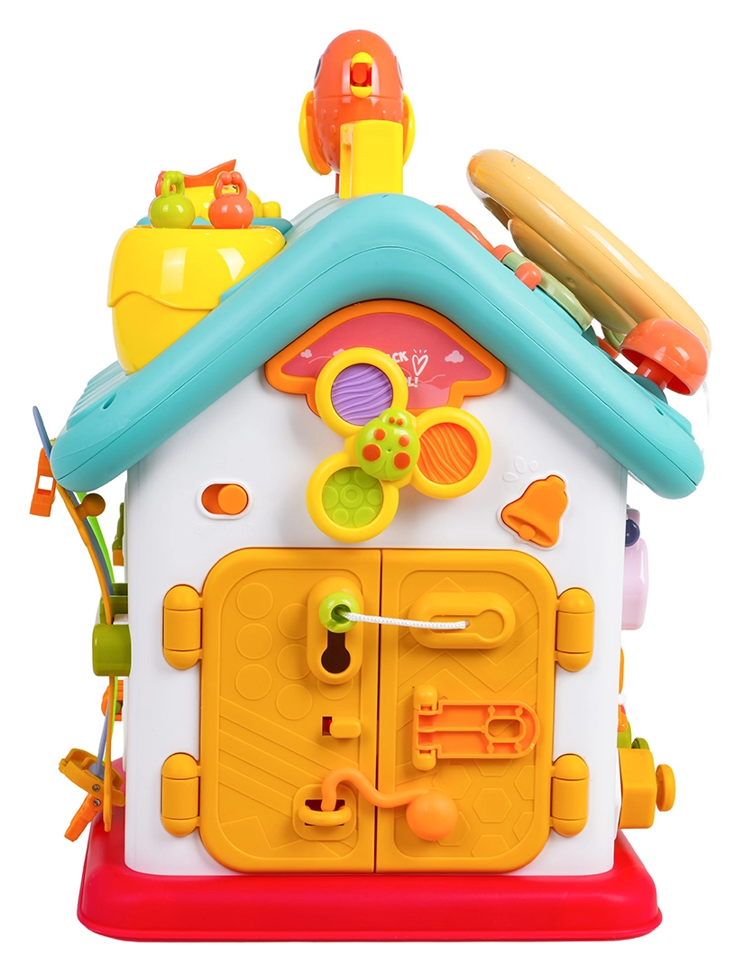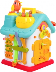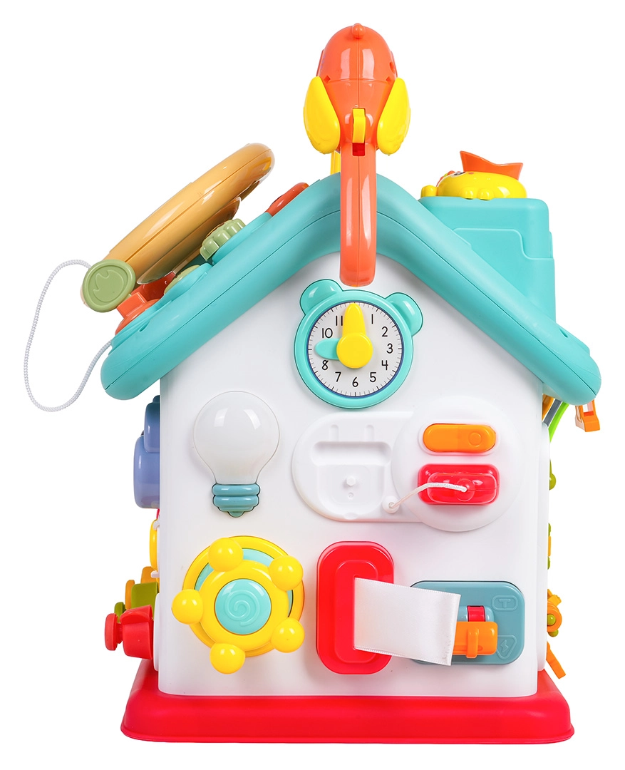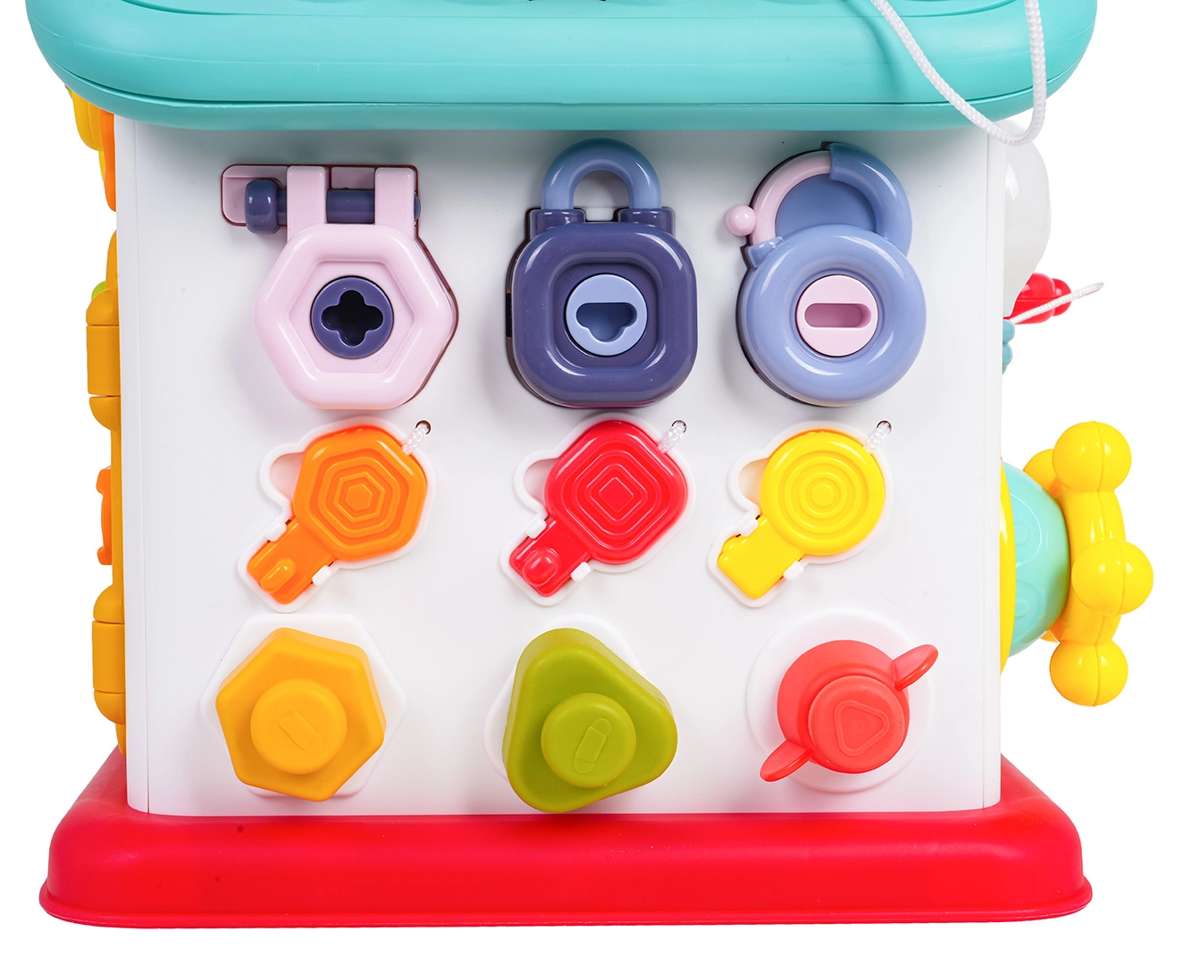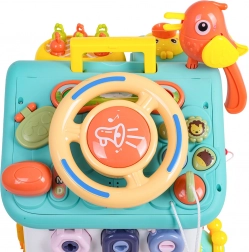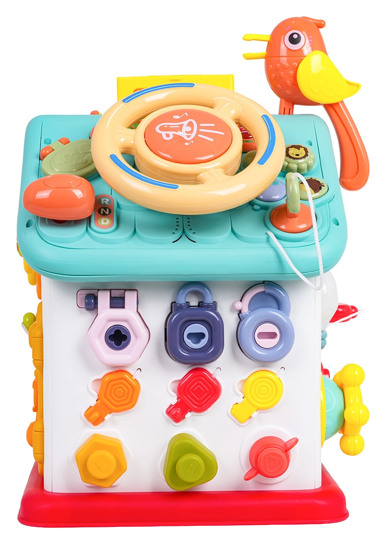 Tento barevný interaktivní domeček nabízí bohaté aktivity na všech stranách i na střeše: podsvícený volant s klaksonem, směrovkami a startérem s klíčkem, sadu zámků a klíčů pro párování, hodiny s pohyblivými ručičkami, vypínače, převody a další manipulativní prvky. Děti si procvičí koordinaci oko–ruka a pochopí princip příčina–následek.