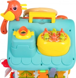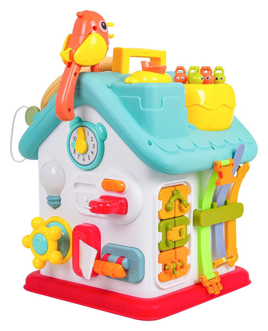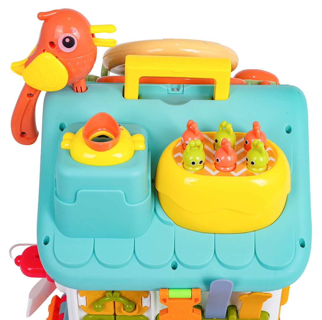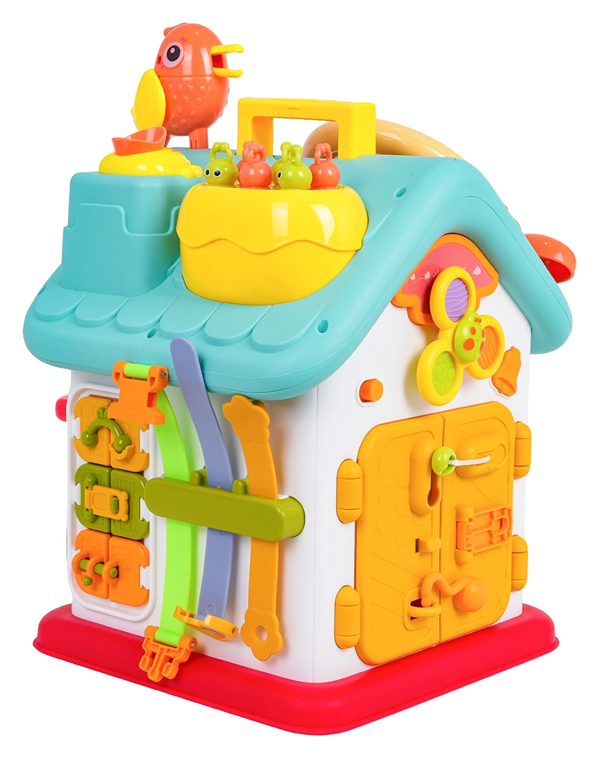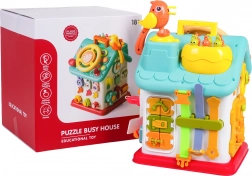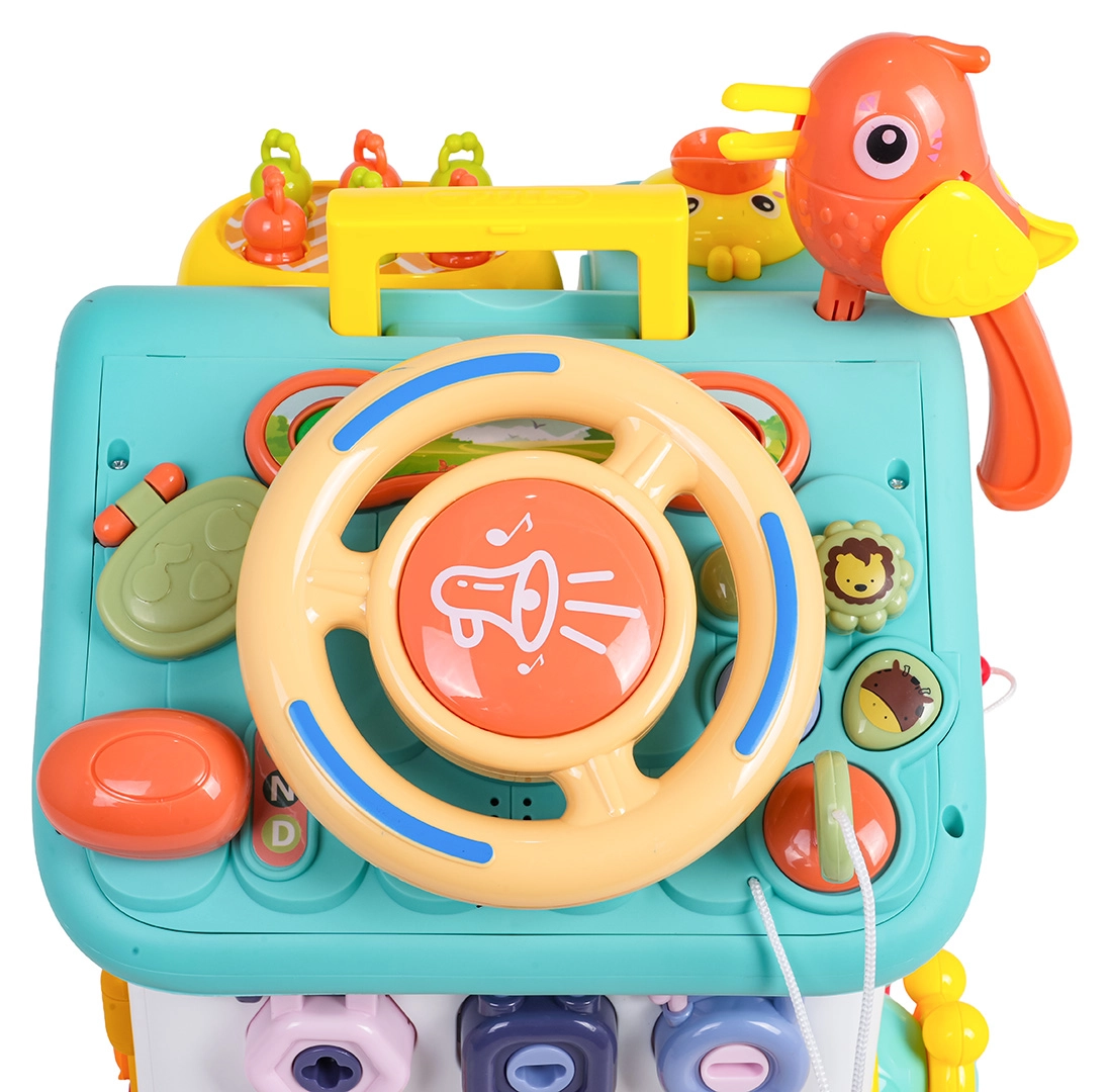 Tento barevný interaktivní domeček nabízí bohaté aktivity na všech stranách i na střeše: podsvícený volant s klaksonem, směrovkami a startérem s klíčkem, sadu zámků a klíčů pro párování, hodiny s pohyblivými ručičkami, vypínače, převody a další manipulativní prvky. Děti si procvičí koordinaci oko–ruka a pochopí princip příčina–následek.