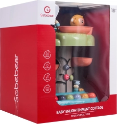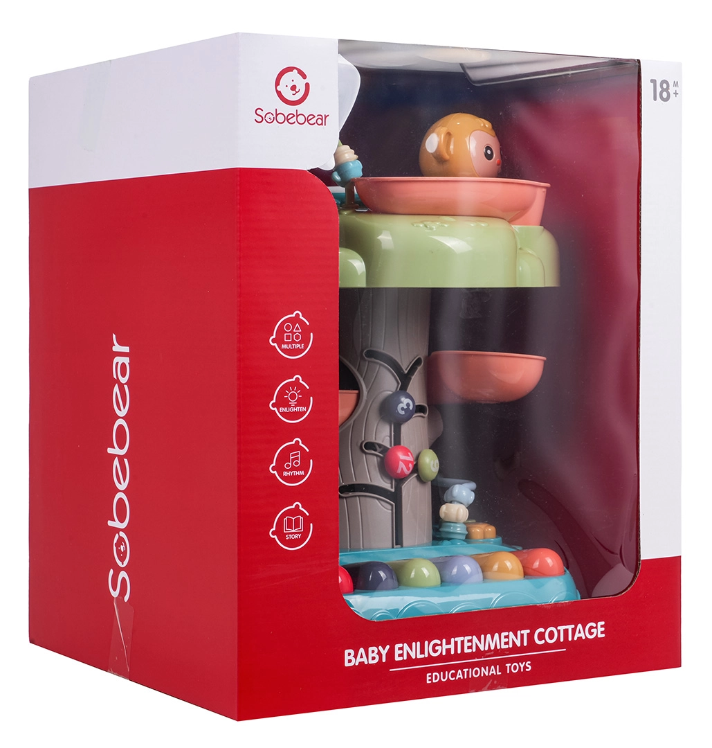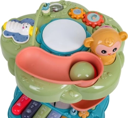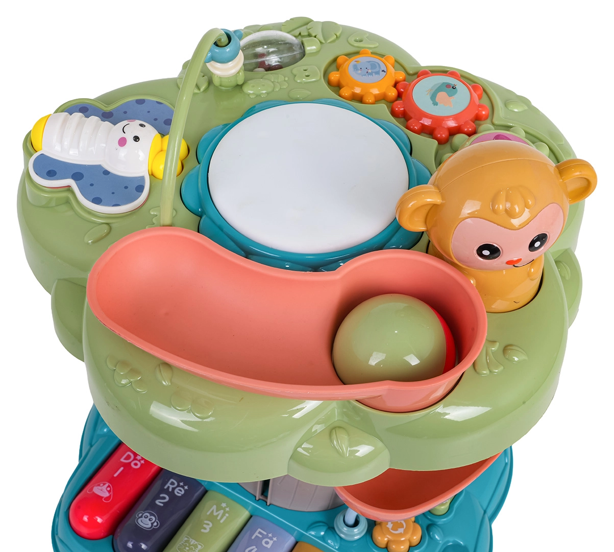 Nechybí korálkový labyrint, ozubená kolečka, vyjímatelná chrastítka a zvířátka na šňůrce k párování tvarů. Děti mohou mačkat tlačítka, točit, přemisťovat a bubnovat – každá akce vyvolá zvuk či světlo. Hračka je vyrobena z odolného plastu bez ostrých hran a je navržena pro bezpečné domácí hraní.