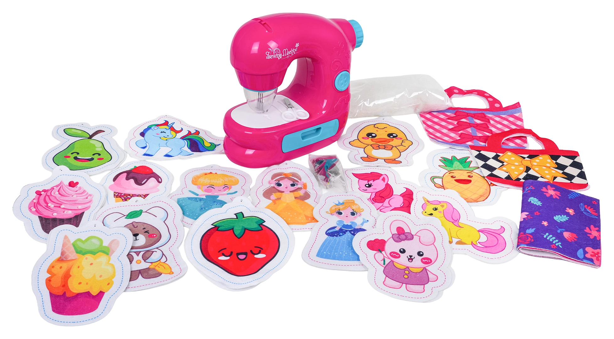 Filcové tvary kabelek, látky, šablony, výplň, nůžky a kuličkové řetízky – vše připravené k výrobě hraček a doplňků.