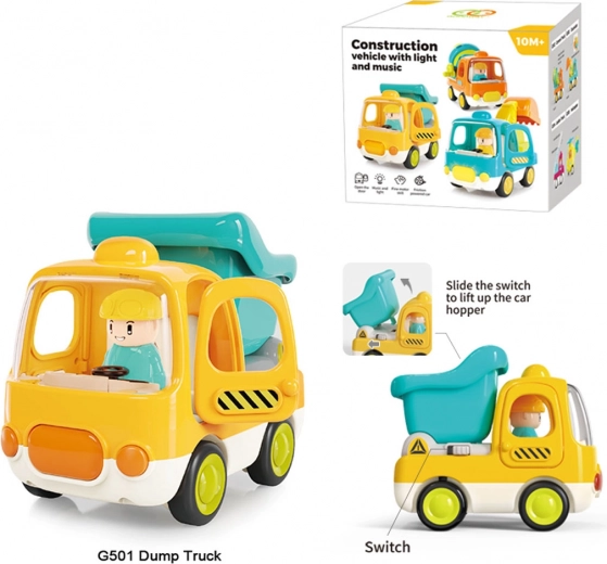 Roztomilý interaktivní sklápěč pro děti od 10 měsíců přináší spoustu zábavy i rozvoje smyslů. Nabízí světelné a zvukové efekty, gumové pneumatiky, pohybující se dveře a korbu a snadné ovládání díky frikčnímu pohonu. Vyroben z odolného a bezpečného plastu bez ostrých hran. Baterie 3× AG13 jsou součástí balení.