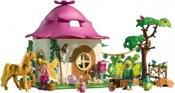 Vstupte do fantazijního lesa, kde víly pečují o svého lesklého zlatého jednorožce a prožívají kouzelná dobrodružství. Domeček ve tvaru houby s růžovou střechou, otvíracími dvířky a okénky nabízí útulné zázemí pro hraní – od postele ve tvaru listu až po malou lesní kuchyňku.