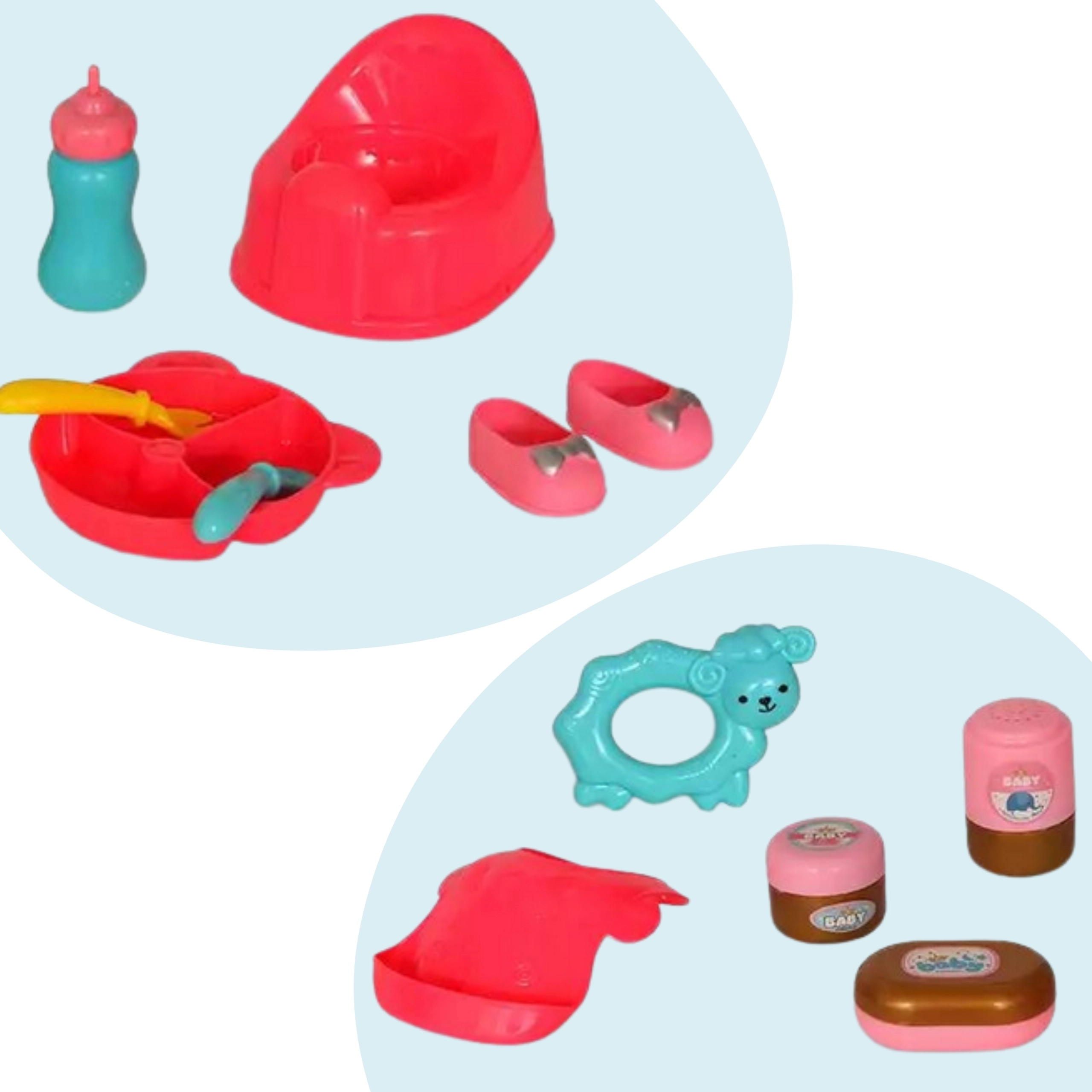 - Panenka mořská víla, kočárek-paraplíčko, cestovní postýlka/kojec, hrací podložka s hrazdičkou, tašky, nočník, doplňky ke krmení a péči