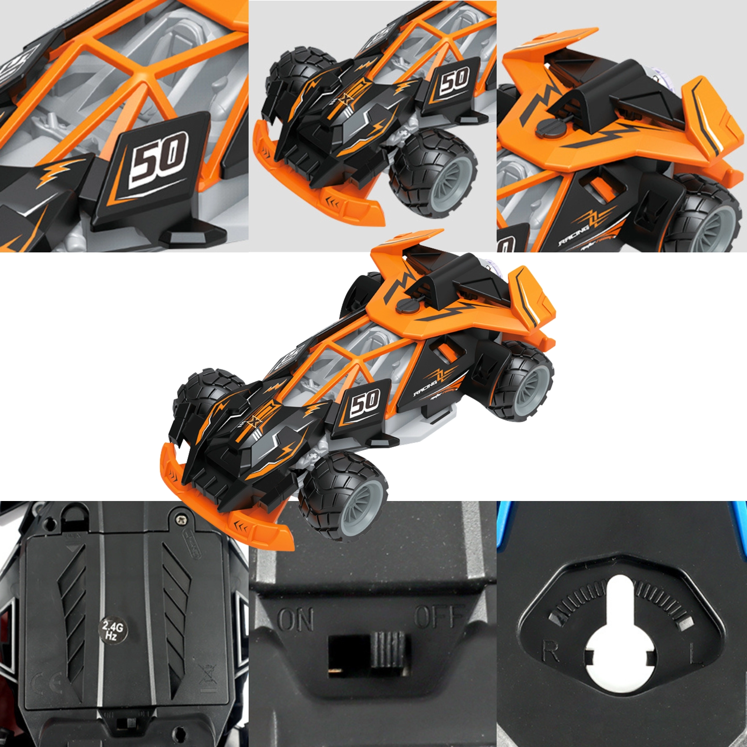Velká terénní kola zajišťují dobrou přilnavost na kobercích, parketách i na chodníku. Auto je vybaveno přepínačem ON/OFF a posuvníkem kalibrace řízení na podvozku pro přesné nastavení. Zadní „reaktivní“ efekt s párou přidává zábavný vizuální prvek.