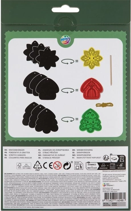 Škrabací sada MOXY s vánočními motivy přináší jednoduchý a veselý způsob, jak si vyrobit vlastní dekorace. Každý z devíti přívěsků má černou vrchní vrstvu, pod níž se ukrývají pestré barvy. Stačí použít přiložené škrabátko a postupně vykreslit tvary – výsledkem jsou jedinečné vánoční ozdoby, které potěší malé i velké.