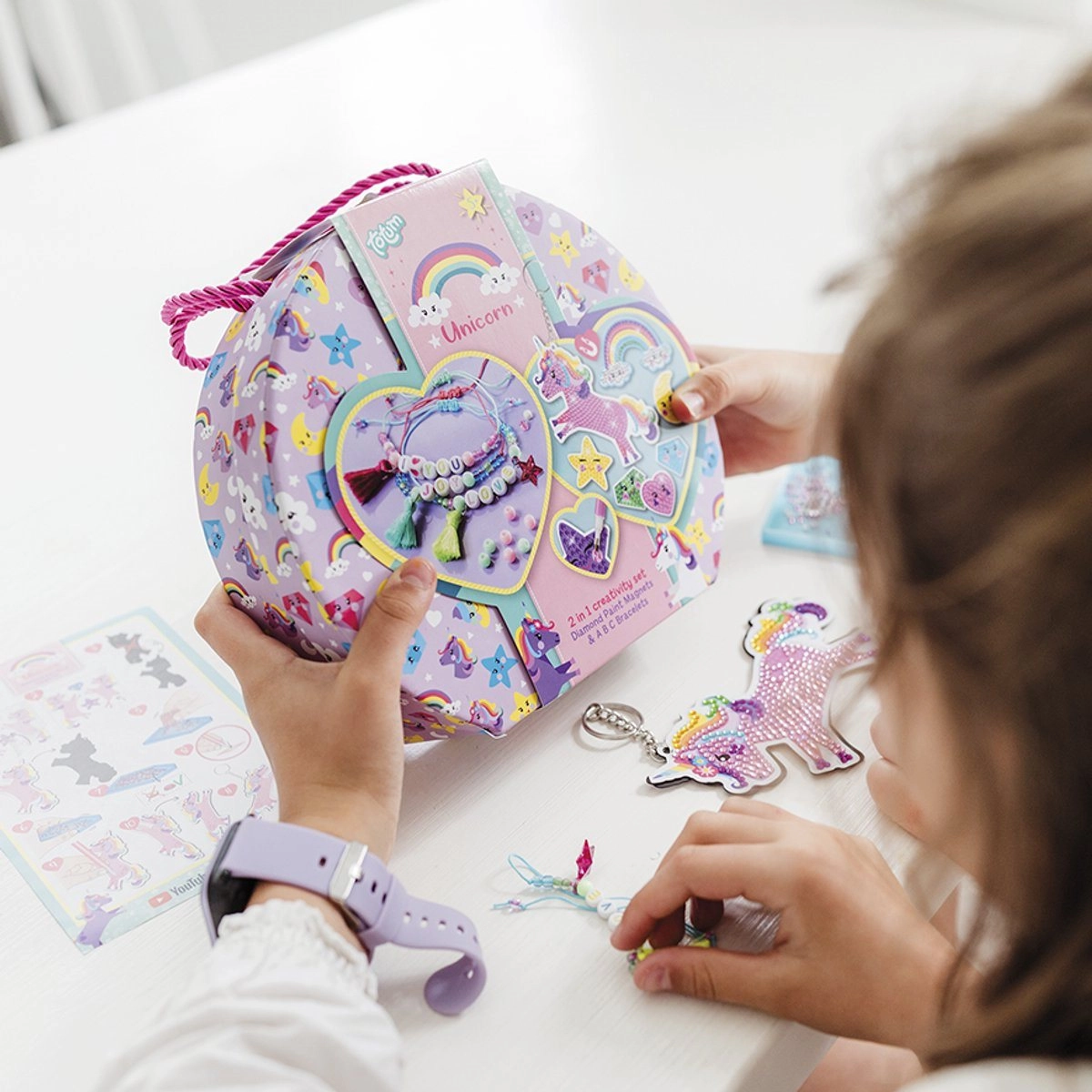 Tato zábavná sada nabízí dvojitou porci tvoření: děti mohou vytvořit až 9 magnetů s jednorožčími motivy pomocí diamantových kamínků a samolepek a také až 3 originální náramky z barevných korálků, písmen a saténových šňůrek. Vše je přehledně uloženo v roztomilém kufříku, ideálním na ukládání i přenášení.