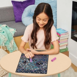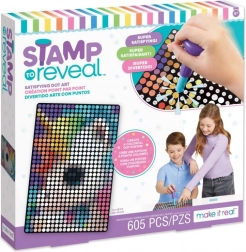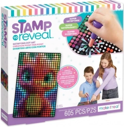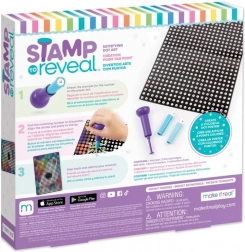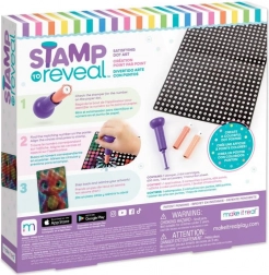 Sada Stamp to Reveal přináší snadný a zároveň návykový způsob, jak tvořit efektní tečkované obrázky. Stačí přiložit razítko k číslu na tečkované kazetě, najít shodné číslo na plakátu, zarovnat kruhy a orazítkovat. S každým otiskem se motiv více odhaluje a výsledný barevný plakát se zářivým drakem je připravený na vystavení.