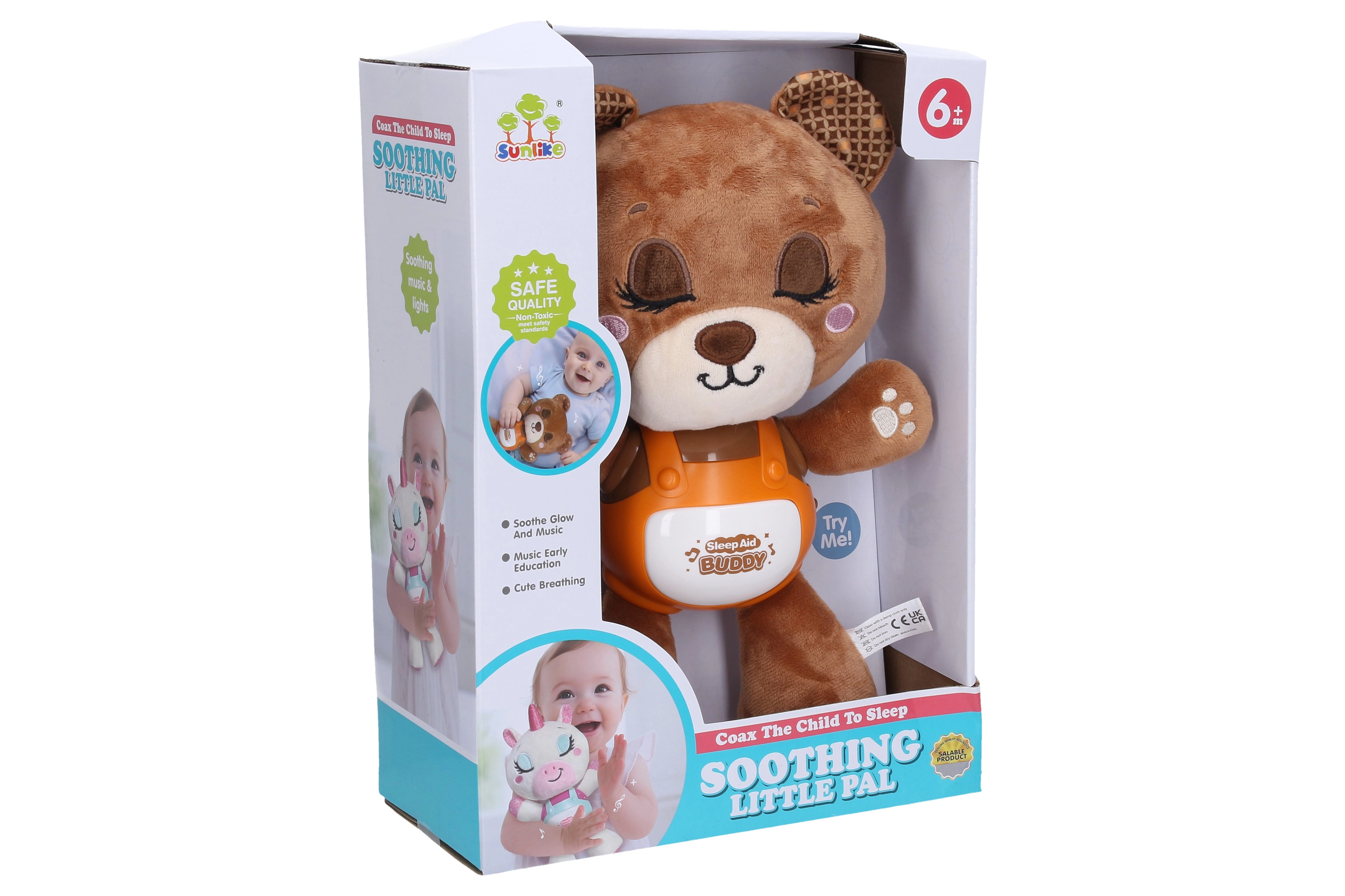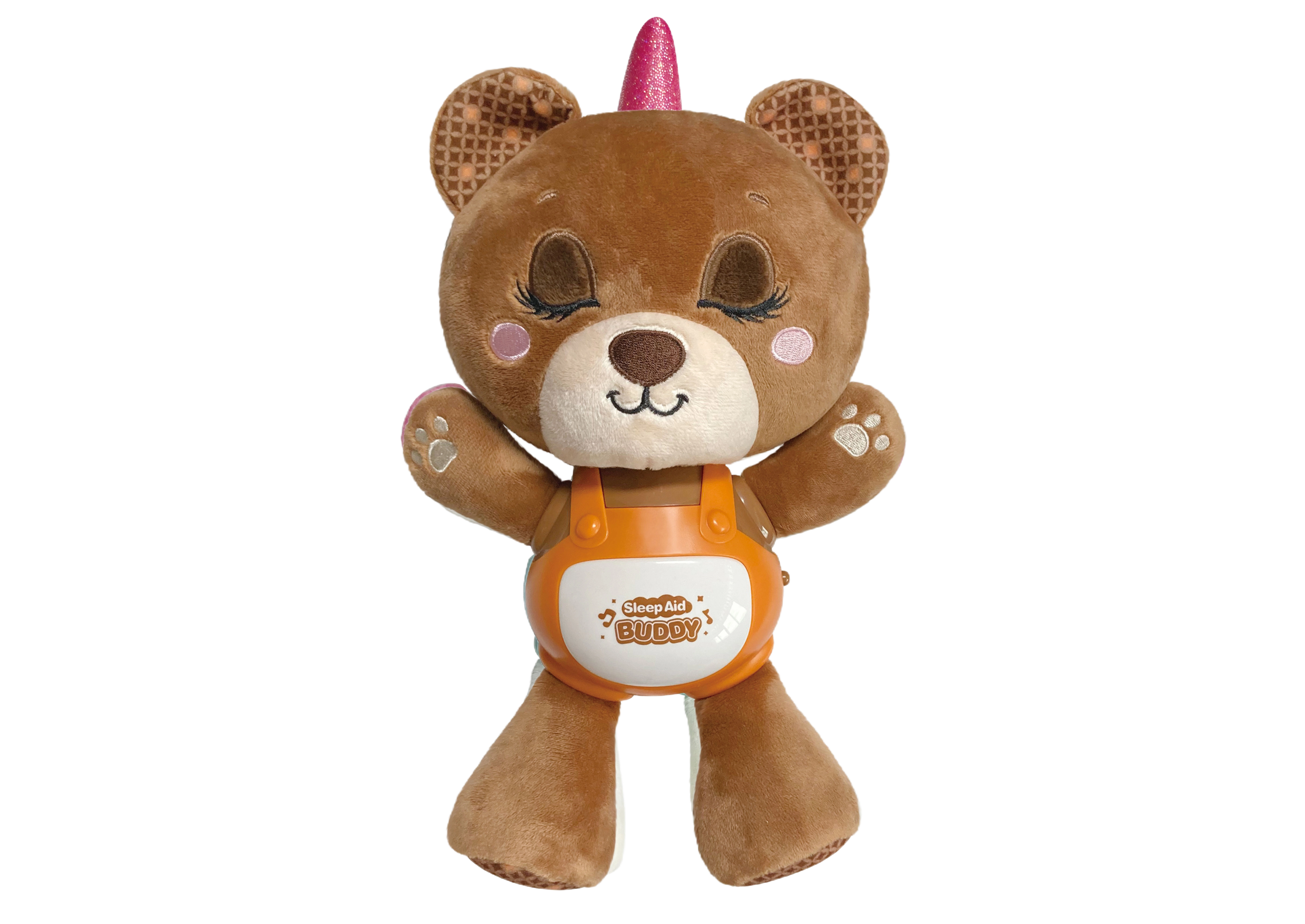 Roztomilý usínáček ve tvaru medvídka o velikosti 29 cm pomáhá dětem klidně usnout díky kombinaci ukolébavek, uklidňující hudby, zvuku chrápání a jemného nočního světla. Ovládání je snadné – stačí stisknout bříško a přepínat mezi režimy. Praktický přepínač on/off je umístěn na boku.