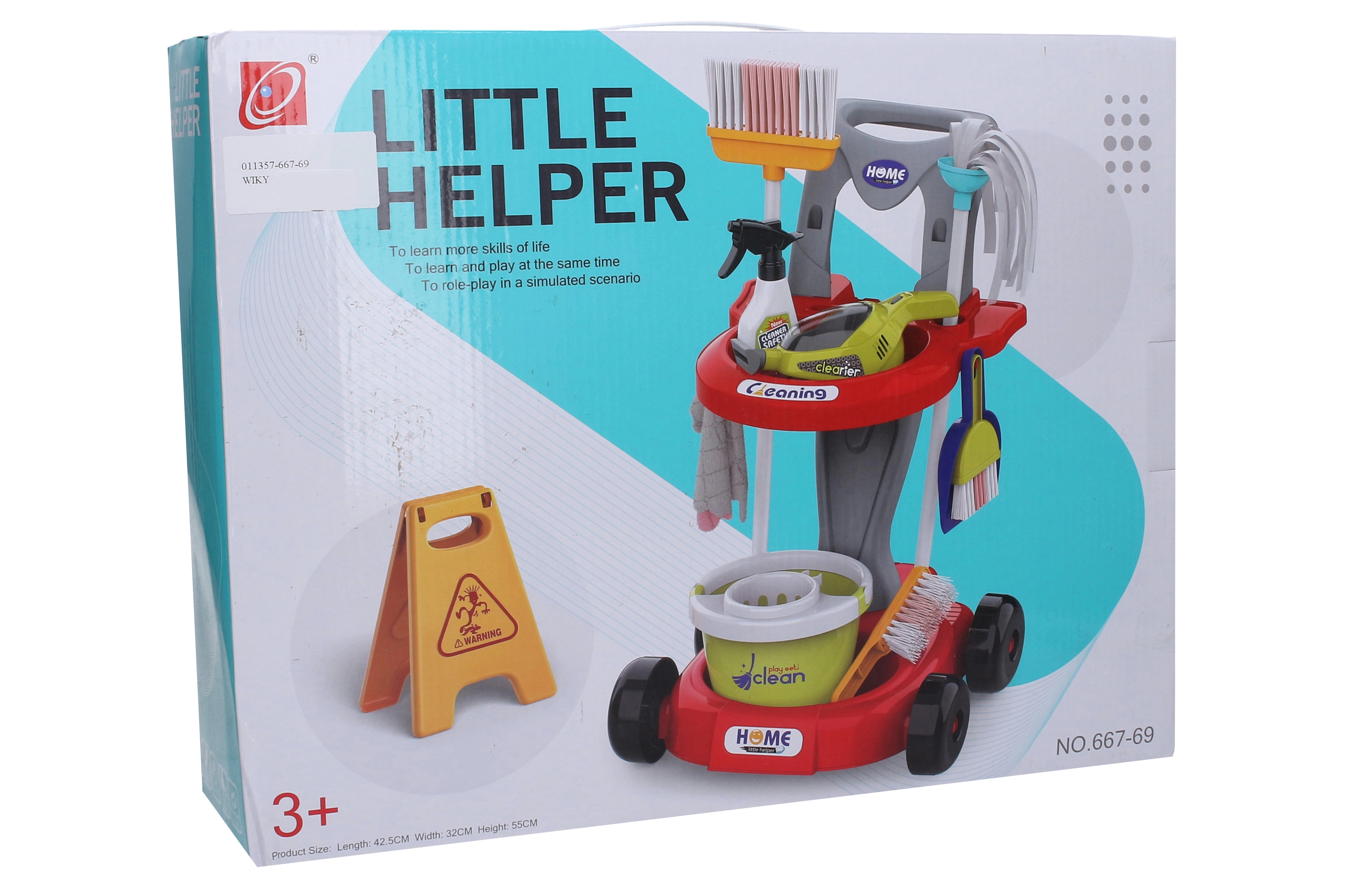 Zábavný a praktický dětský úklidový vozík vysoký 55 cm přináší vše potřebné pro hru na domácnost. Souprava obsahuje vozík, smětaček s lopatkou, mop, smeták, ruční vysavač, rozprašovač, kbelík a varovnou ceduli „Pozor, mokrá podlaha“. Sestavení je snadné díky přiloženému návodu, vysavač vyžaduje 3× AA baterie (nejsou součástí).