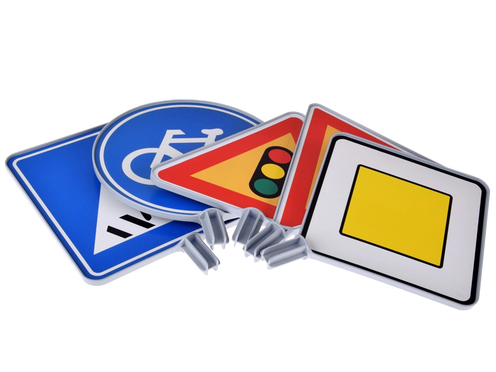 Každý znak se skládá z podstavy, tyčí a spojek, které se rychle a jednoduše montují. Podstavy lze naplnit vodou nebo pískem pro maximální stabilitu. Lehký, ale odolný plast je bezpečný pro děti a barevné samolepky jsou výborně čitelné.