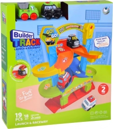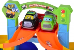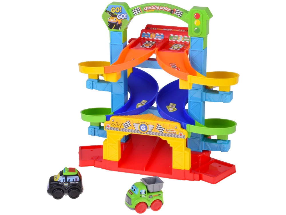 Dvojitá startovací věž se „starting point“ a páčkou vypustí dvě autíčka najednou. Děti si užijí napínavý start a mohou závodit bok po boku.
