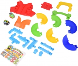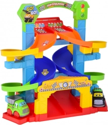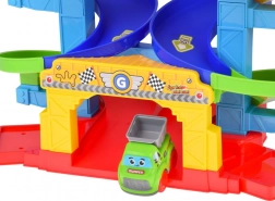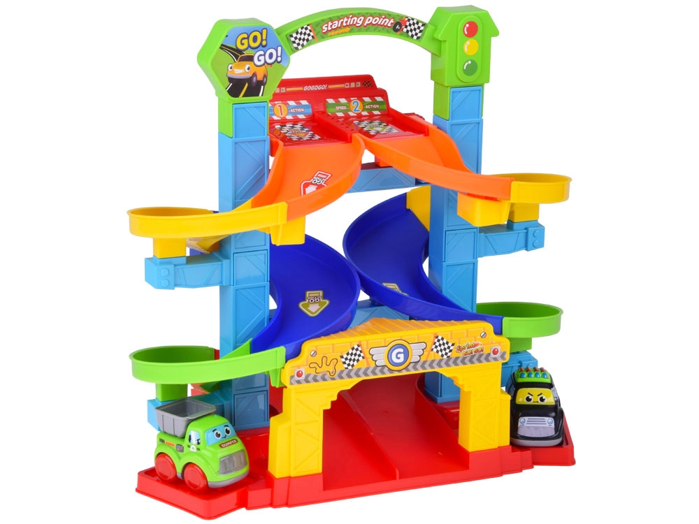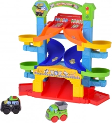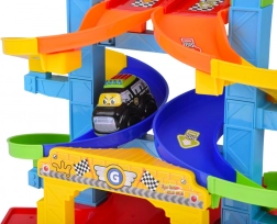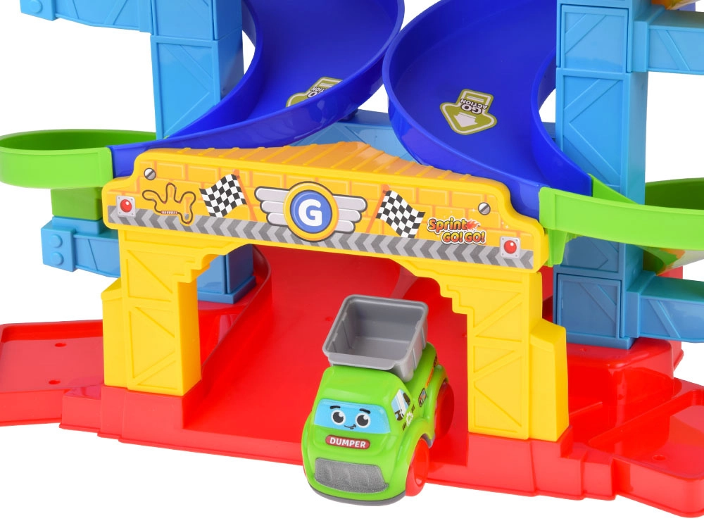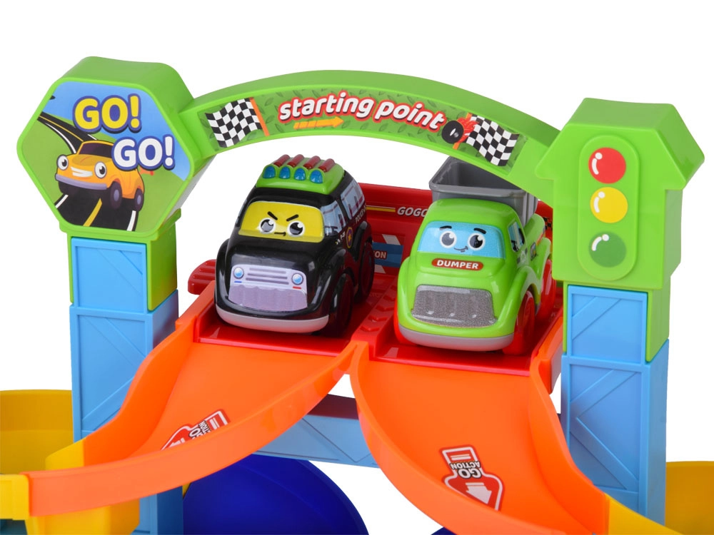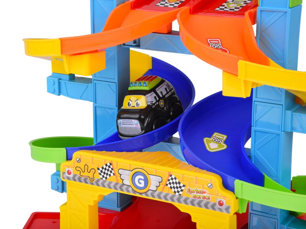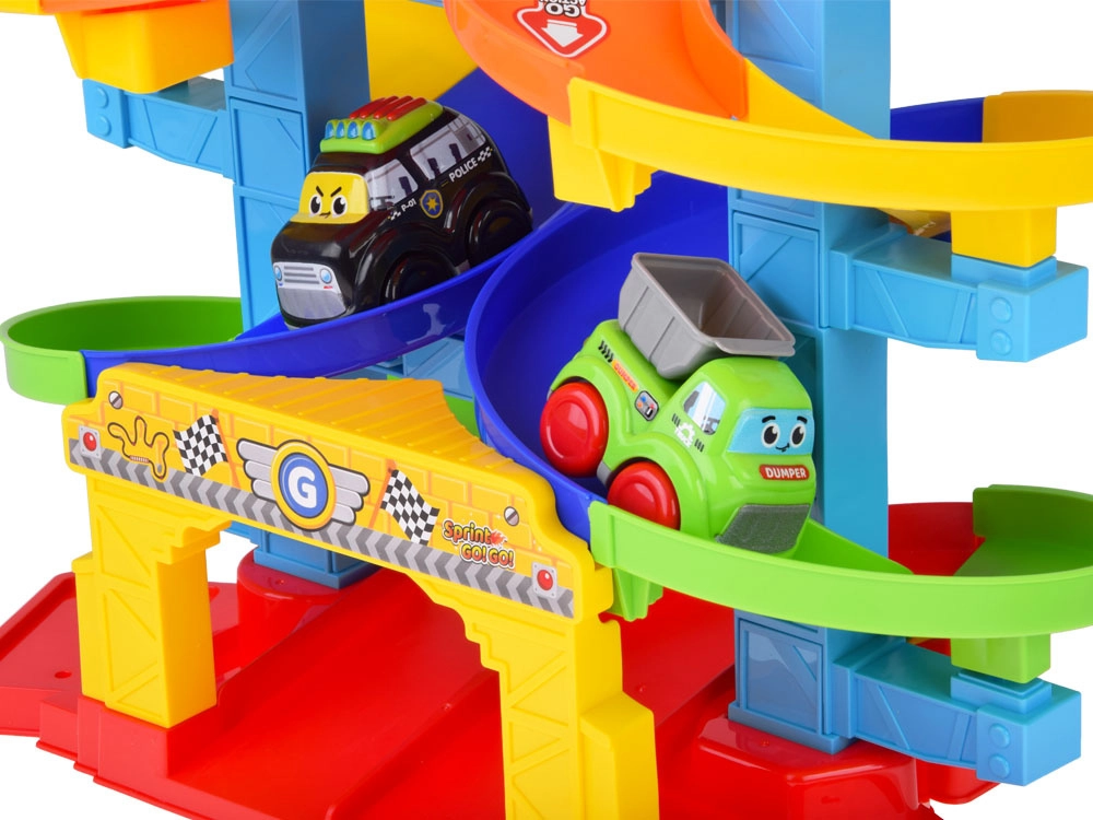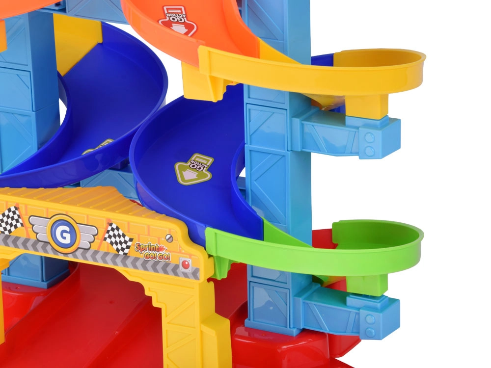 Barevné točité dráhy vedou autíčka bezpečně dolů. Stabilní sloupky a široké mantinely zajišťují plynulou jízdu bez zasekávání.