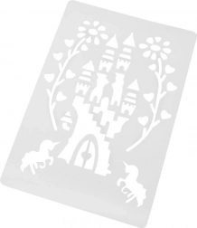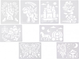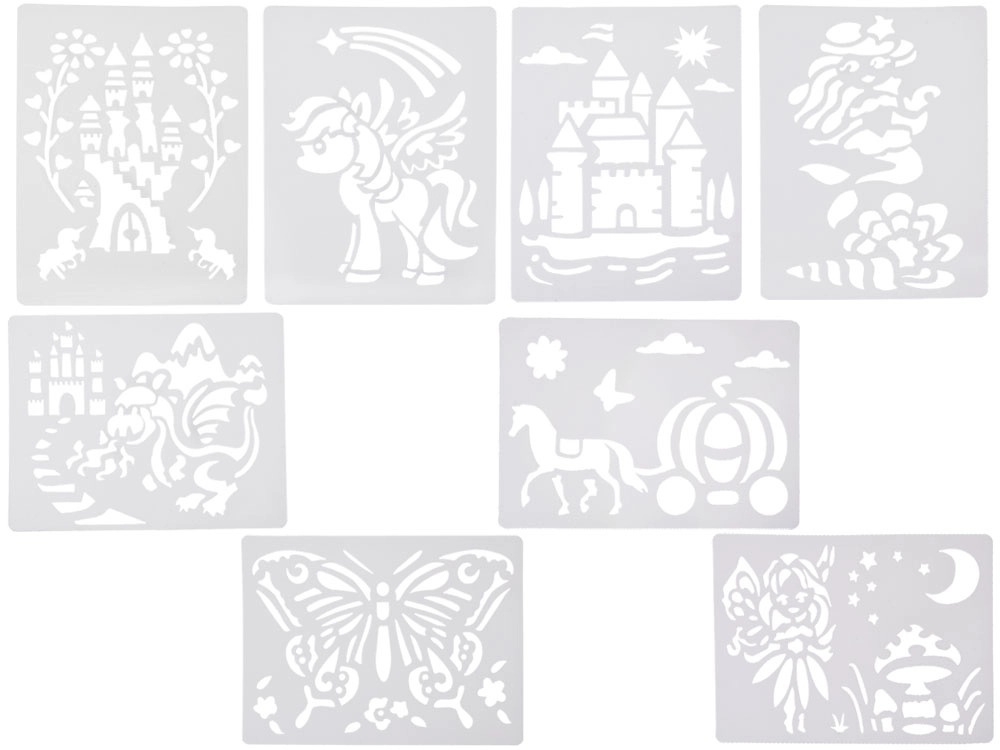 Součástí balení jsou znovupoužitelné plastové šablony s oblíbenými motivy (např. motýl, zámky, drak, mořská víla, koník s kočárem, lesní víla, kůň/kucík), 12 barevných fix, 10 listů papíru a magická pumpička. Šablony stačí po použití nechat uschnout a můžete tvořit znovu.