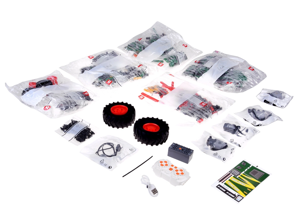 Součástí balení je přehledná obrazová instrukce, samolepky, USB kabel a dálkový ovladač. Stavebnice rozvíjí jemnou motoriku, logické myšlení a technické dovednosti – od převodů až po řízení servem.