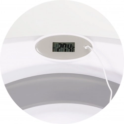 Integrovaný teploměr pomůže nastavit ideální teplotu vody. Výpustný otvor s praktickou zátkou urychlí vypuštění bez zvedání vaničky.