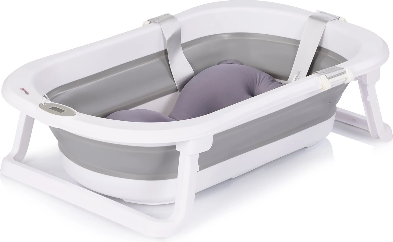 Praktická dětská vanička CHIPOLINO Malibu v elegantní šedé barvě nabízí bezpečné a pohodlné koupání od novorozence po batole. Díky skládacímu designu, kovovému stojanu v ergonomické výšce a koupací podložce pro oporu miminka je koupání snadné, šetrné k zádům rodičů a bezpečné. Nechybí vestavěný teploměr, výpustný otvor a protiskluzové prvky pro maximální stabilitu.