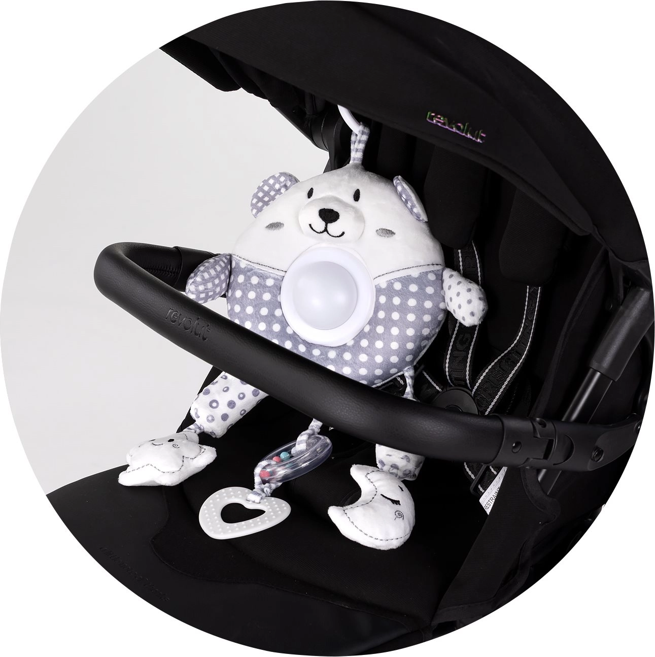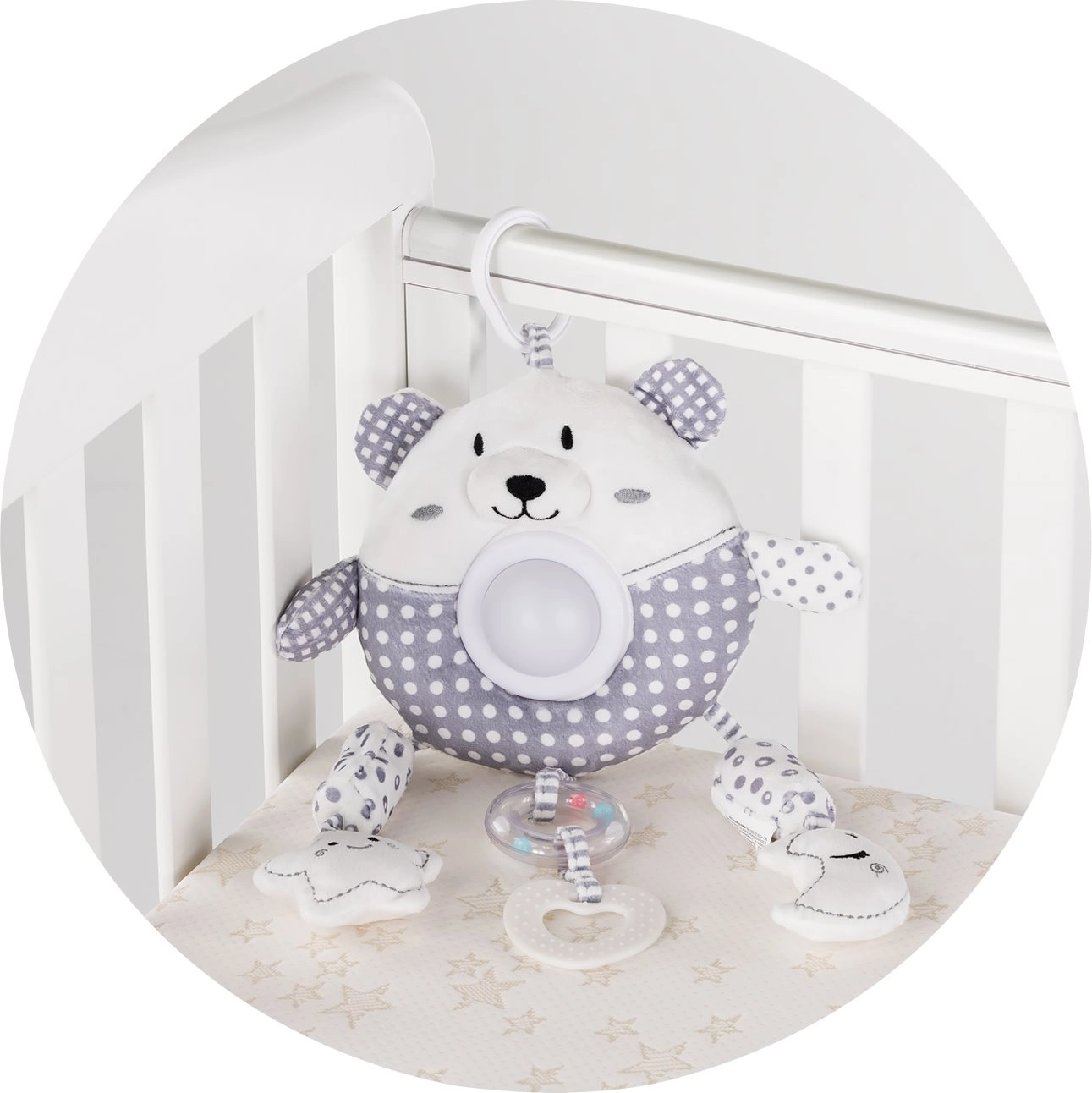 Hračka je kompaktní a snadno se upevní pomocí praktického klipu na kočárek, autosedačku nebo postýlku. Různé závěsné prvky (kousátko, chrastítko) podněcují jemnou motoriku a zvědavost dítěte.