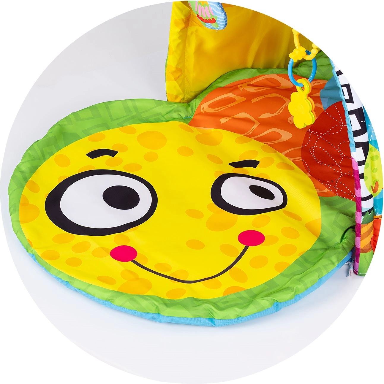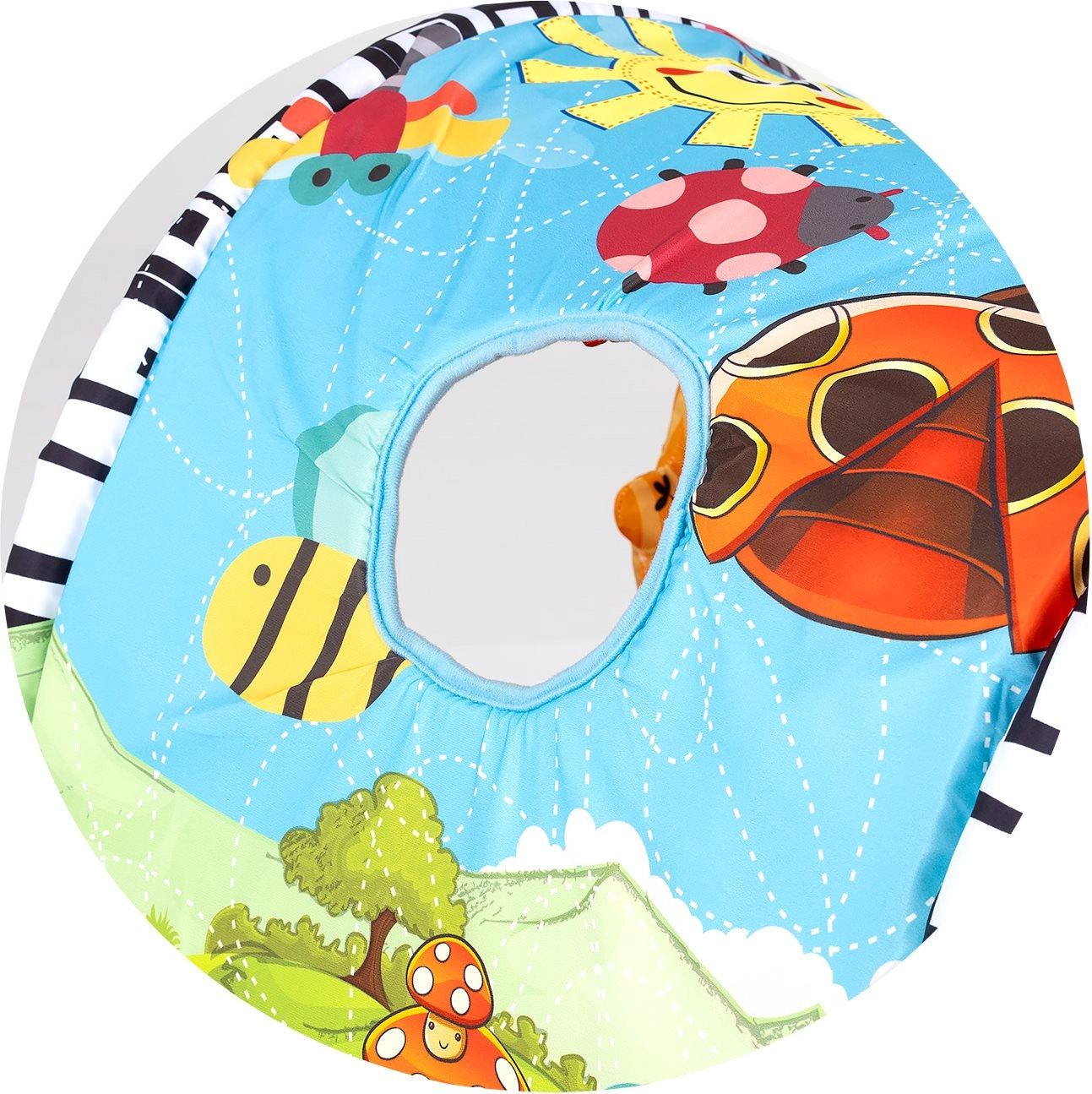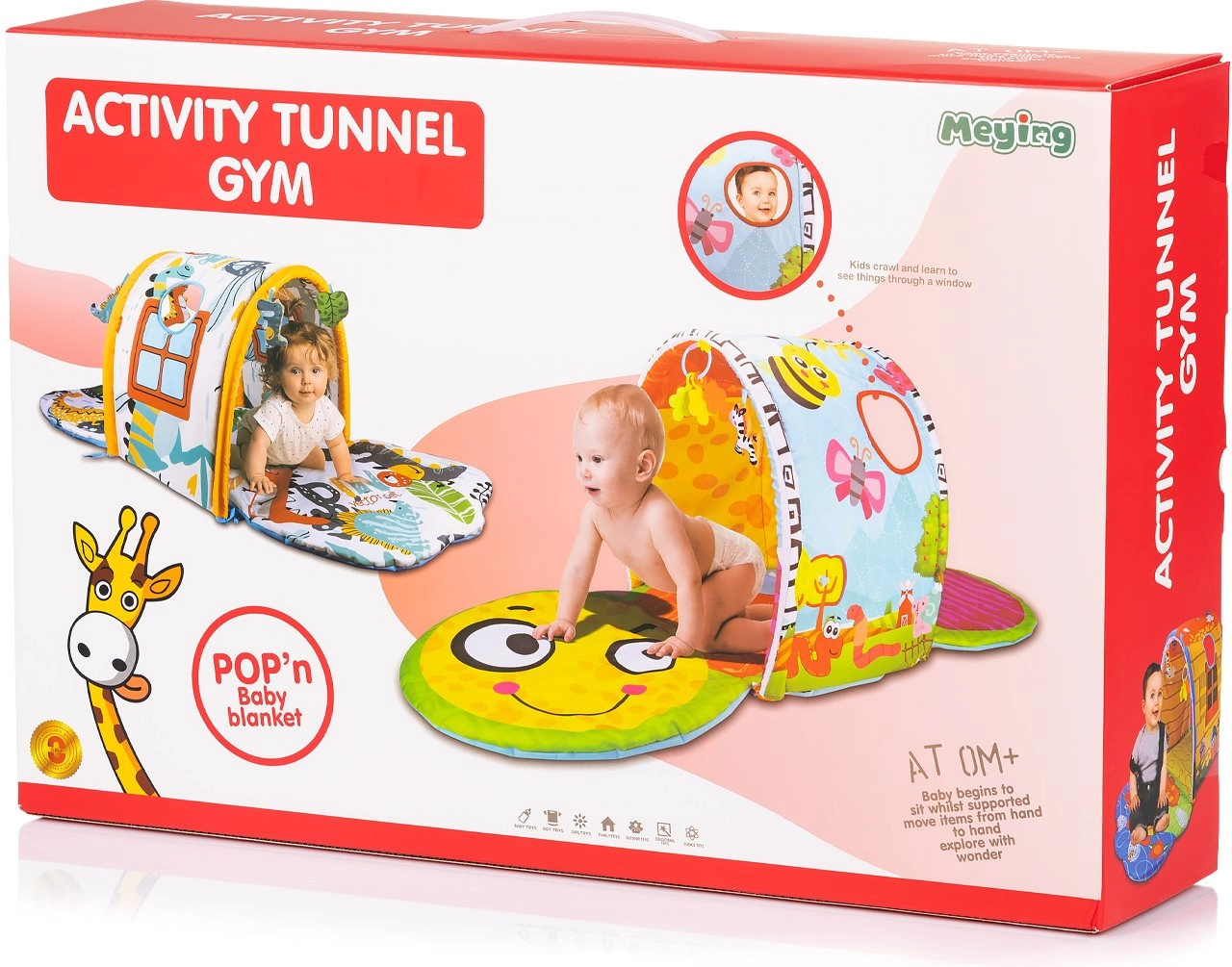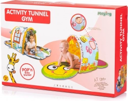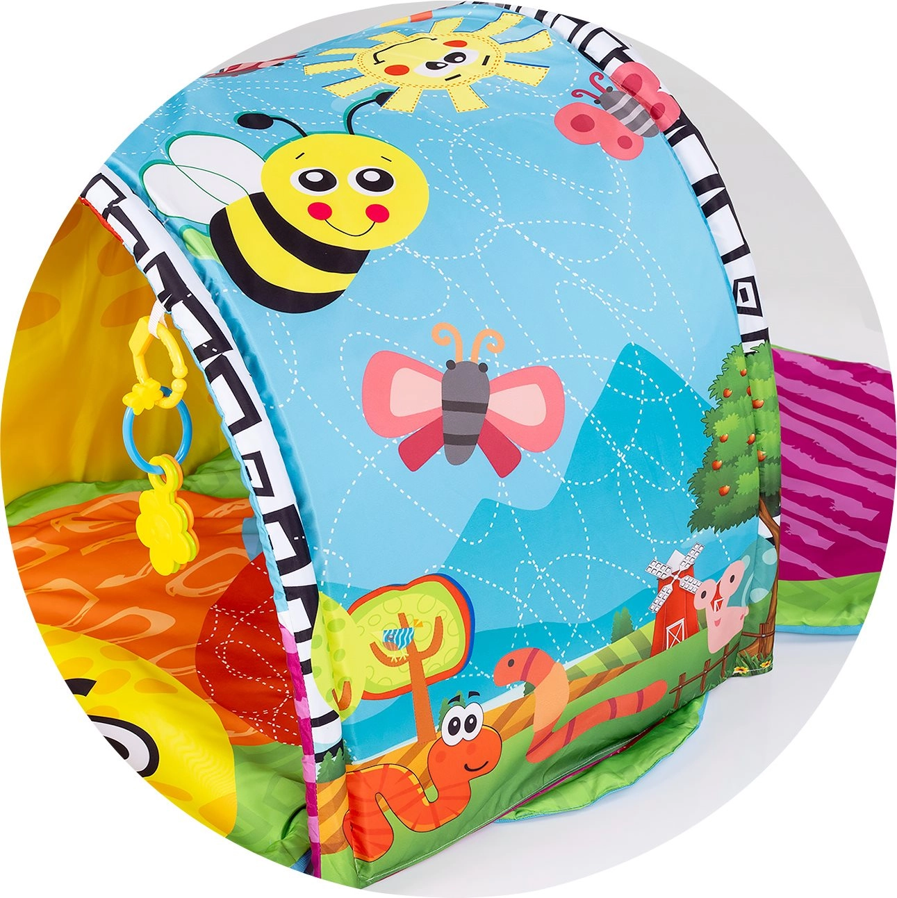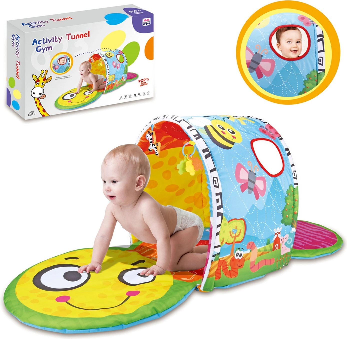 Barevné vzory, závěsné hračky a bezpečný tunel podporují smyslové vnímání, koordinaci ruka–oko a rozvoj hrubé motoriky od prvních měsíců.