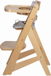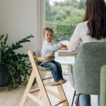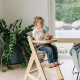 Pultík s vybráním na hrnek i dřevěná zábrana lze snadno sejmout, takže dítě může později sedět přímo u stolu s rodinou.