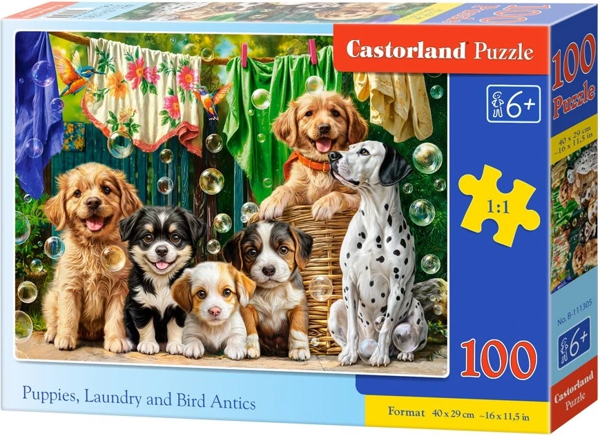 Objevte kouzlo skládání s půvabným motivem „Štěňata, prádlo a ptačí dovádění“. Puzzle CASTORLAND vyniká přesnými výseky a sytými barvami, které potěší při každém skládačkovém dobrodružství. Sestavený obrázek o rozměru cca 40 × 29 cm se skvěle hodí k vystavení v dětském pokoji.