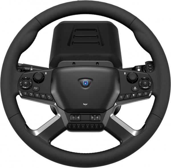 Volant o průměru 40 cm s povrchem z umělé kůže a rozsahem 1800° přináší autentický pocit z řízení těžkých nákladních vozů na silnici i v depu.