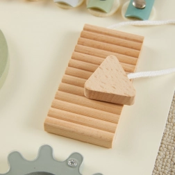 Xylofon, převody, bludiště, posuvné a otevírací prvky, korálky i dvířka s překvapením – vše motivuje děti ke zkoumání a rozvíjí jemnou motoriku a logiku.