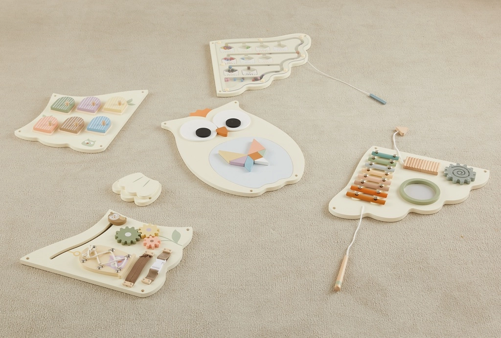 Tato designová sova s roztaženými křídly nabídne dětem hravé objevování: xylofon, ozubená kolečka, posuvné a otevírací prvky, bludiště, korálky, dvířka s hmatovým překvapením i magnetickou tabulku. Velkorysé rozměry podporují společnou hru více dětí a současně vytvářejí stylovou dekoraci na zeď.