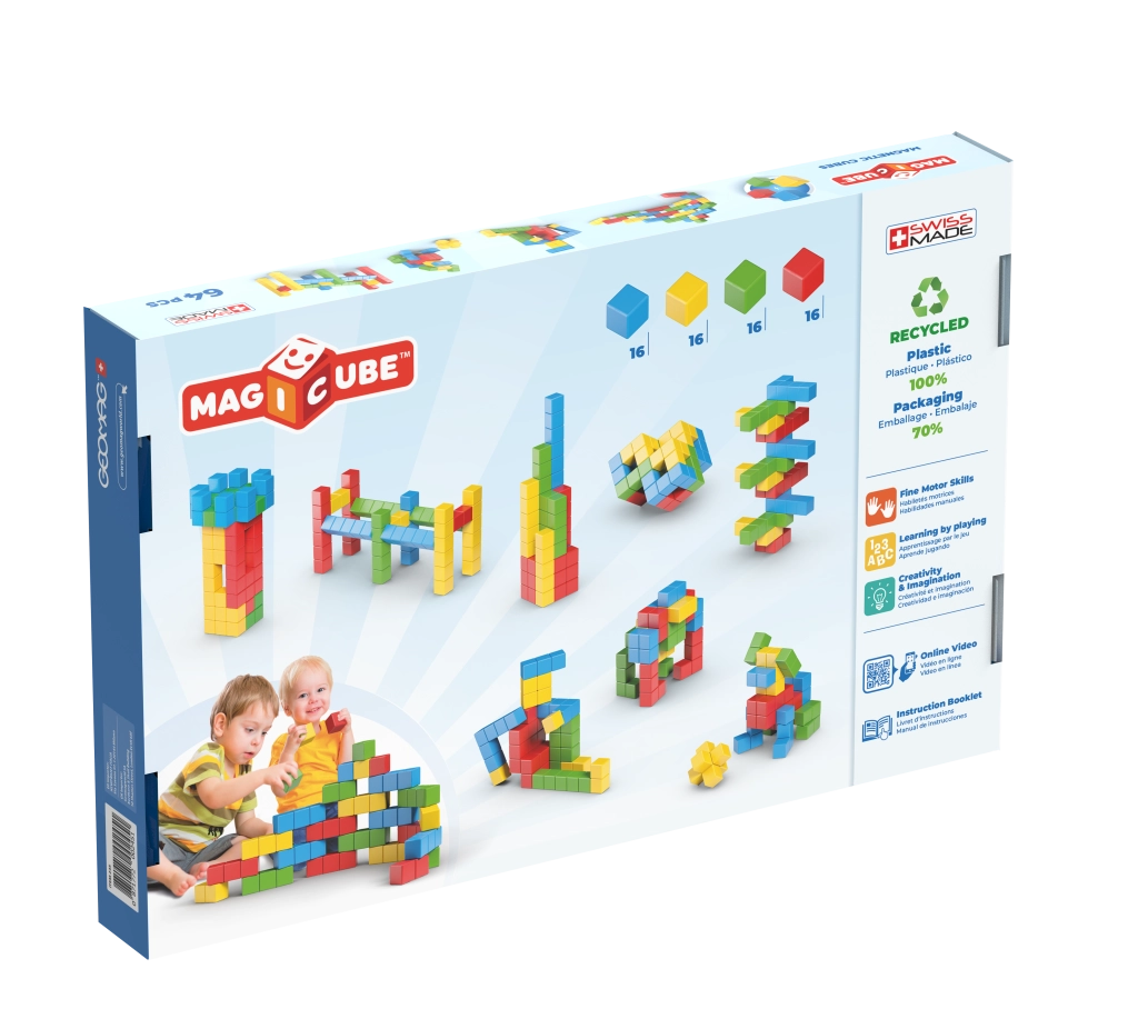 Objevte tvoření ve 3D s magnetickými kostičkami GEOMAG MAGICUBE. Díky speciální vnitřní konstrukci se kostky přitahují ze všech šesti stran, pevně drží i ve volném prostoru a umožňují jednoduché a bezpečné stavění už od 1 roku. Balení obsahuje 64 kostek ve čtyřech barvách z 100% recyklovaného plastu, vyrobené ve Švýcarsku.