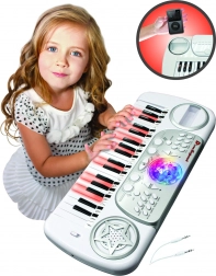 Zábavné dětské klávesy s integrovanou disco koulí a mikrofonem přinášejí hudbu i světelné efekty do každého pokoje. Nabízejí výukovou funkci podle světýlek, 37 kláves, 22 ukázkových skladeb, 8 nástrojů a 8 rytmů. Nechybí nahrávání a přehrávání, nastavení tempa i hlasitosti a konektor pro mobil/mp3. Ideální pro malé začínající hudebníky.