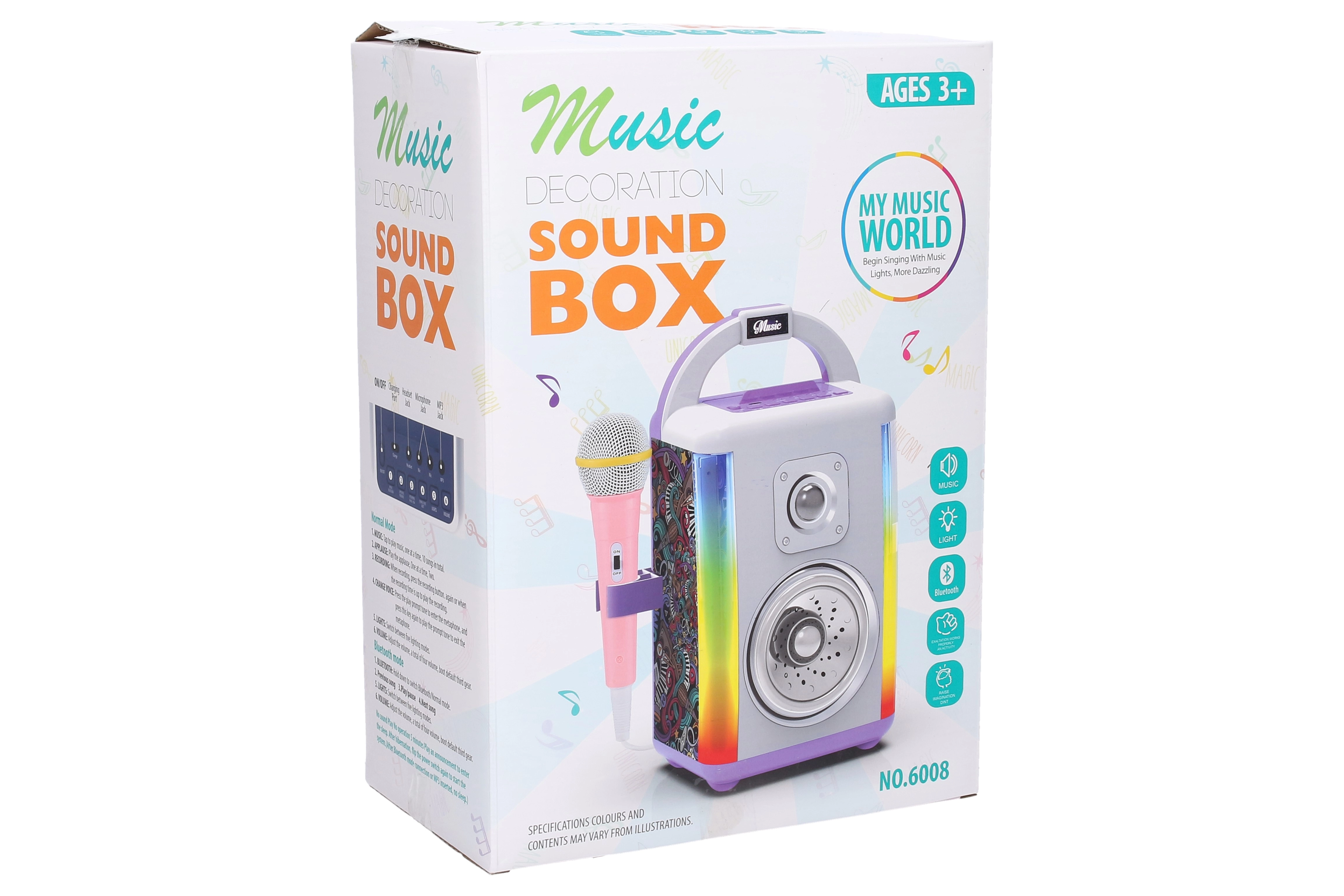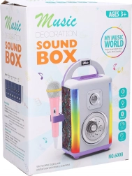 - Hudební box, 1× mikrofon, popis funkcí na obale i v balení