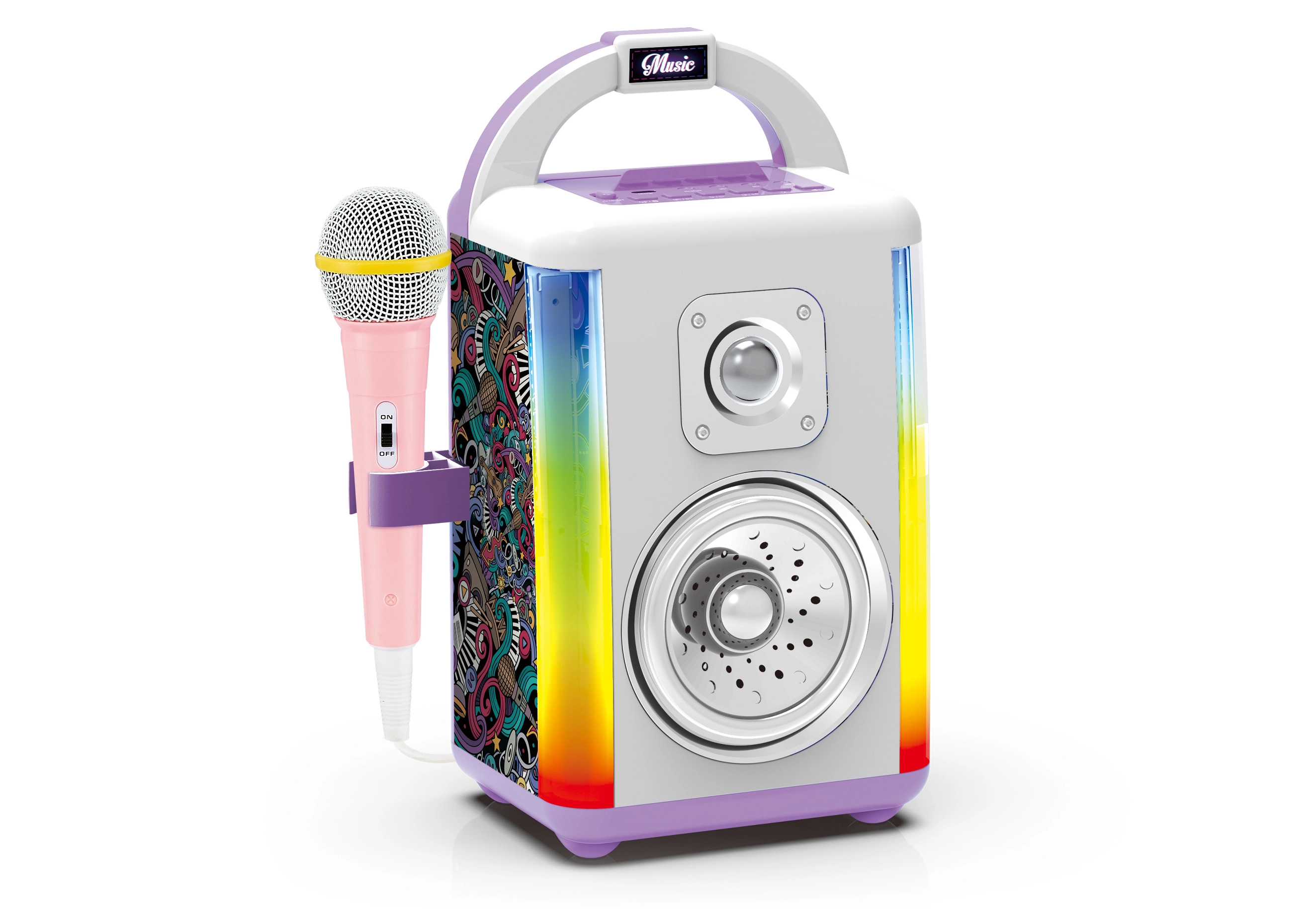 Tento přenosný hudební box je skvělou volbou pro dětské party, rodinné oslavy i trénink zpěvu. Díky bluetooth snadno přehrajete hudbu z telefonu, AUX vstup rozšíří možnosti připojení a pomocí vestavěných efektů můžete nahrávat a měnit hlas pro ještě větší zábavu. Barevné LED osvětlení v pěti režimech dodá show tu správnou atmosféru.