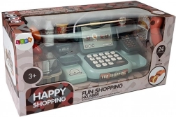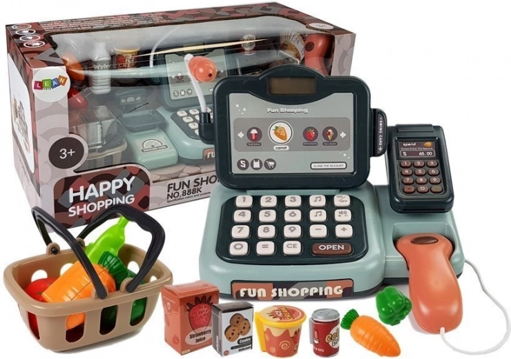V balení najdete vše potřebné: pokladnu s vahou a čtečkou karet, ruční skener, košík, hračky potravin (sušenky, džus, voda, zmrzlina, cola, zelenina), platební kartu, bankovky a 6 plastových mincí. Hra je tak maximálně realistická a rozvíjí dětskou fantazii i jemnou motoriku.