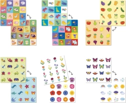 Šest oboustranných karet s 192 obrázky (zvířata, ovoce, květiny, moře a další) udržuje pozornost dětí a nabízí nespočet kombinací ke hře.