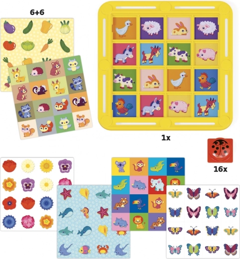 Zábavná vzdělávací hra pro děti od 3 let, která rozvíjí soustředění, vizuální paměť a logické myšlení. Set obsahuje žlutou mřížku, 16 krycích žetonů s beruškami a 6 oboustranných ilustrovaných karet s celkem 192 originálními obrázky zvířátek, ovoce, květin či mořského světa.