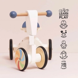Tento stylový dopravní prostředek je ručně domalován ekologickými barvami na vodní bázi a splňuje nejpřísnější bezpečnostní standardy. Duhová kolečka z měkké gumy zajišťují tichou a šetrnou jízdu po podlaze. Odrážedlo podporuje aktivní pohyb, kognitivní dovednosti i představivou hru.