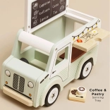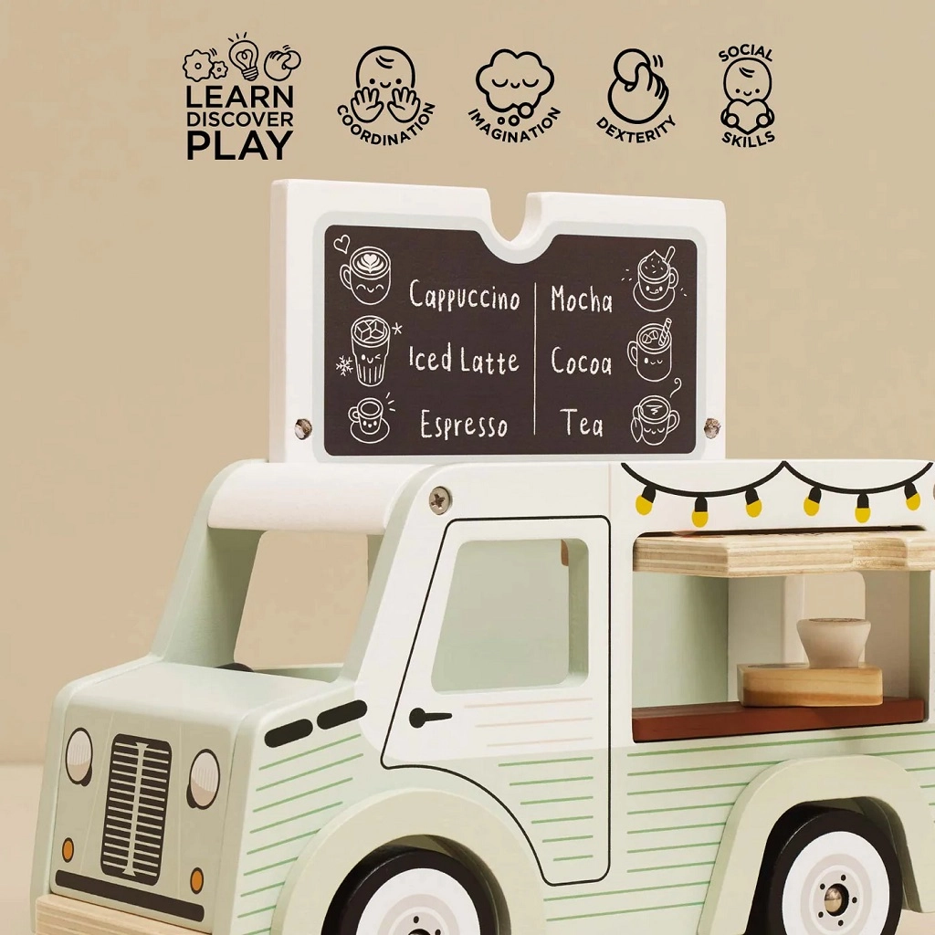 Objevte kouzlo pojízdné kavárny v dětském provedení. Mobilní kavárna Le Toy Van Street Coffee vyniká jemnou pistáciově zelenou a bílou barvou, detailními ilustracemi a promyšlenými funkcemi, které děti vtáhnou do světa představivosti. Stříška se snadno otevírá a uvnitř najdete menu s nabídkou kávy a čaje, přední výdejní okénko zase umožňuje obsluhovat „zákazníky“ jako v opravdové kavárně.