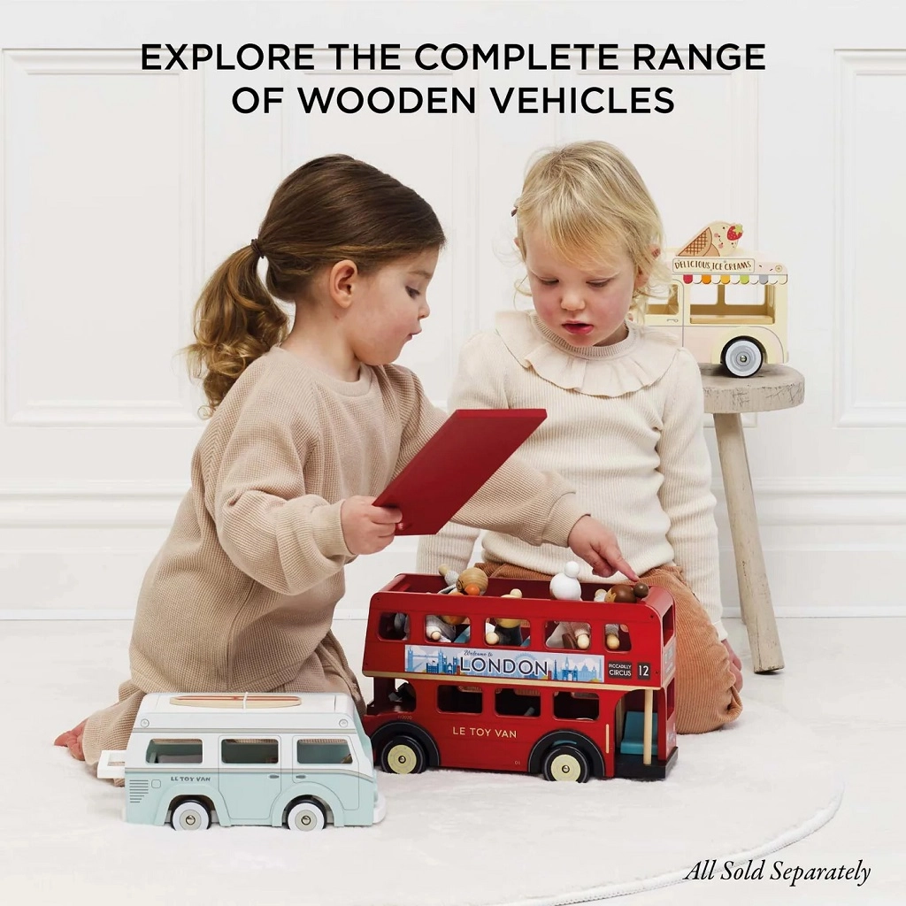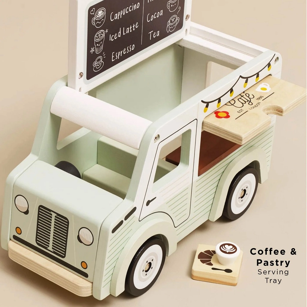Stylová mobilní kavárna od Le Toy Van potěší malé baristy svým retro designem a kvalitním provedením z FSC certifikovaného dřeva. Nabízí otevírací stříšku, výdejní okénko a servírovací tác s doplňky pro realistickou hru. Je ručně domalovaná netoxickými barvami na vodní bázi a podporuje kreativitu i hraní rolí.