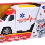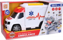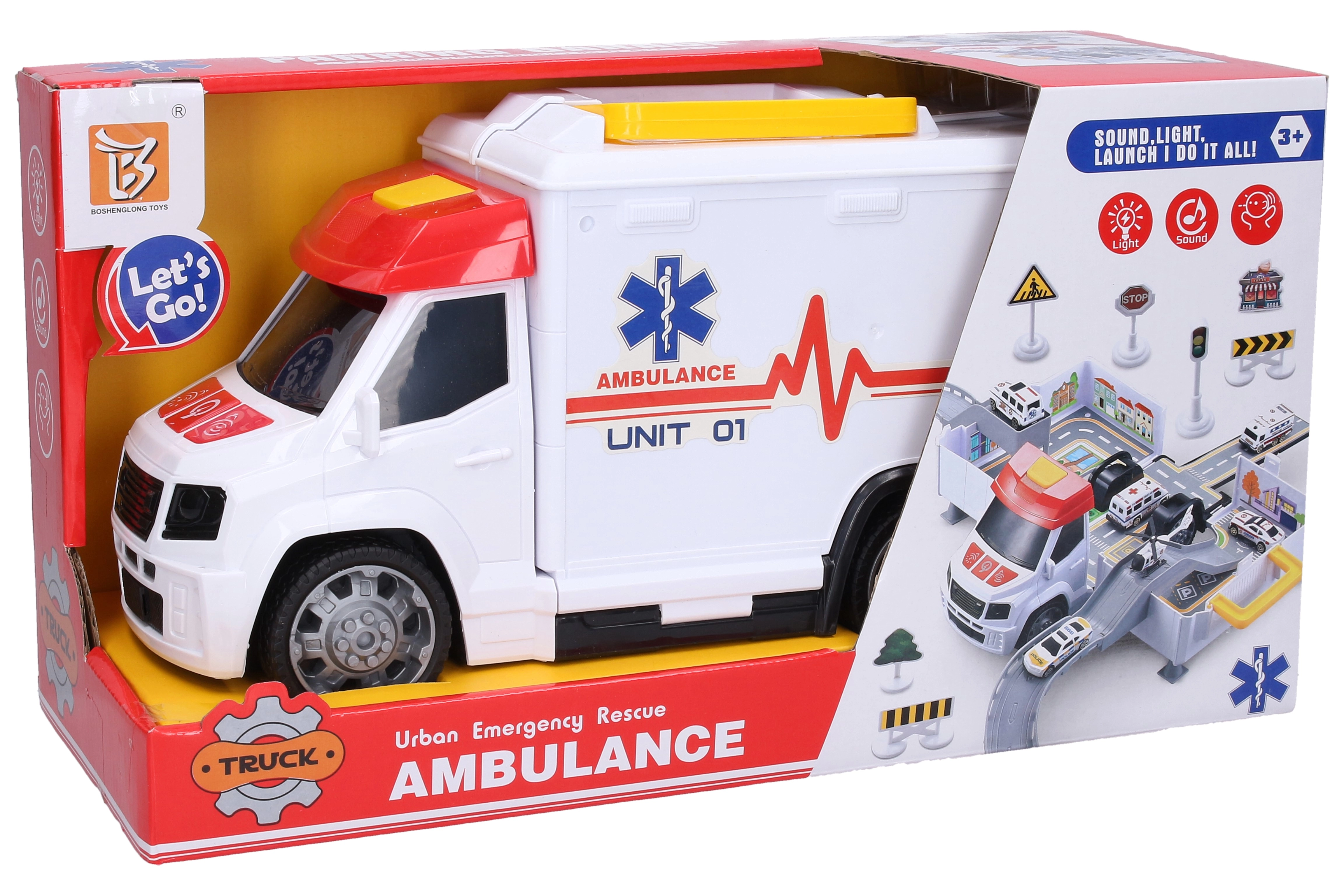 Zábavná a realistická sanitka s rozkládací garáží nemocnice nabídne dětem hodiny hry. Disponuje světelnými a zvukovými efekty, aktivací tlačítky na kapotě a velkým tlačítkem na střeše pro odemčení. Součástí je napájení 3× AG13. Volná kola zajišťují plynulou jízdu a po rozložení vznikne herní areál nemocnice s autíčky a značkami.